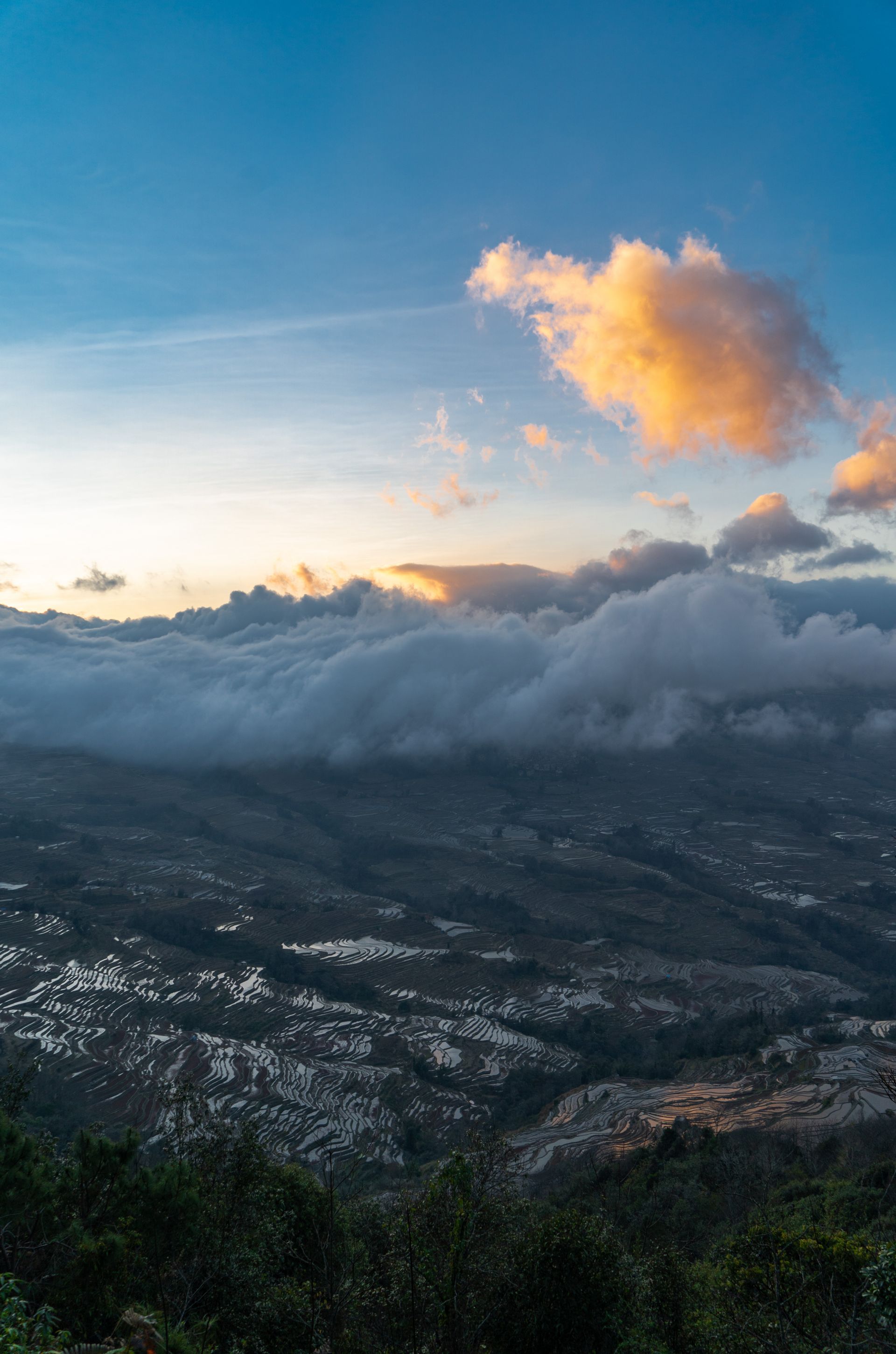 这是1月6日傍晚拍摄的哈尼梯田。 位于云南省哀牢山南部的哈尼梯田见证着当地群众千百年来耕耘劳作的历史,如今,错落有致、雄奇壮美的哈尼梯田吸引着众多游客前来观赏。 新华社记者 王冠森 摄
