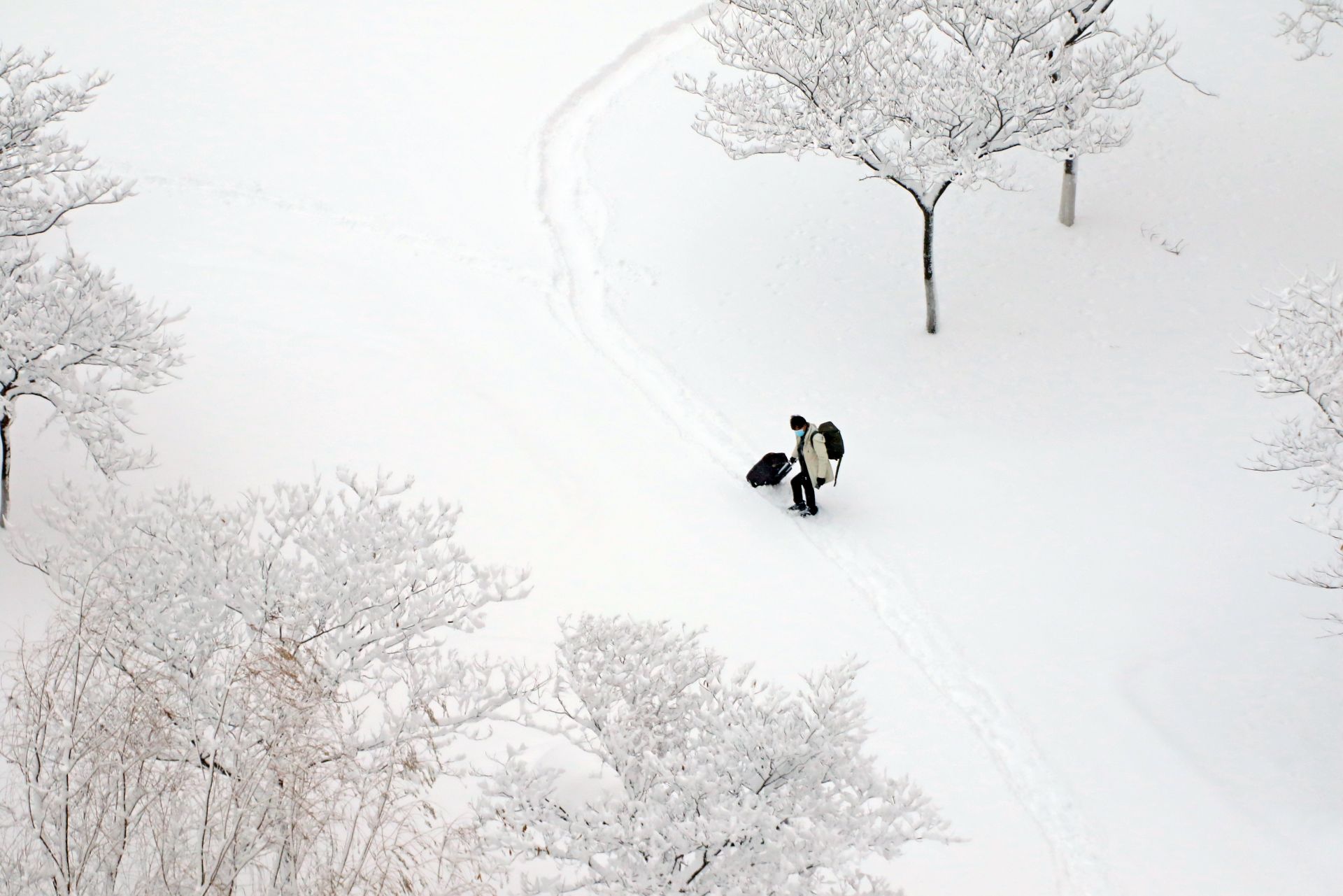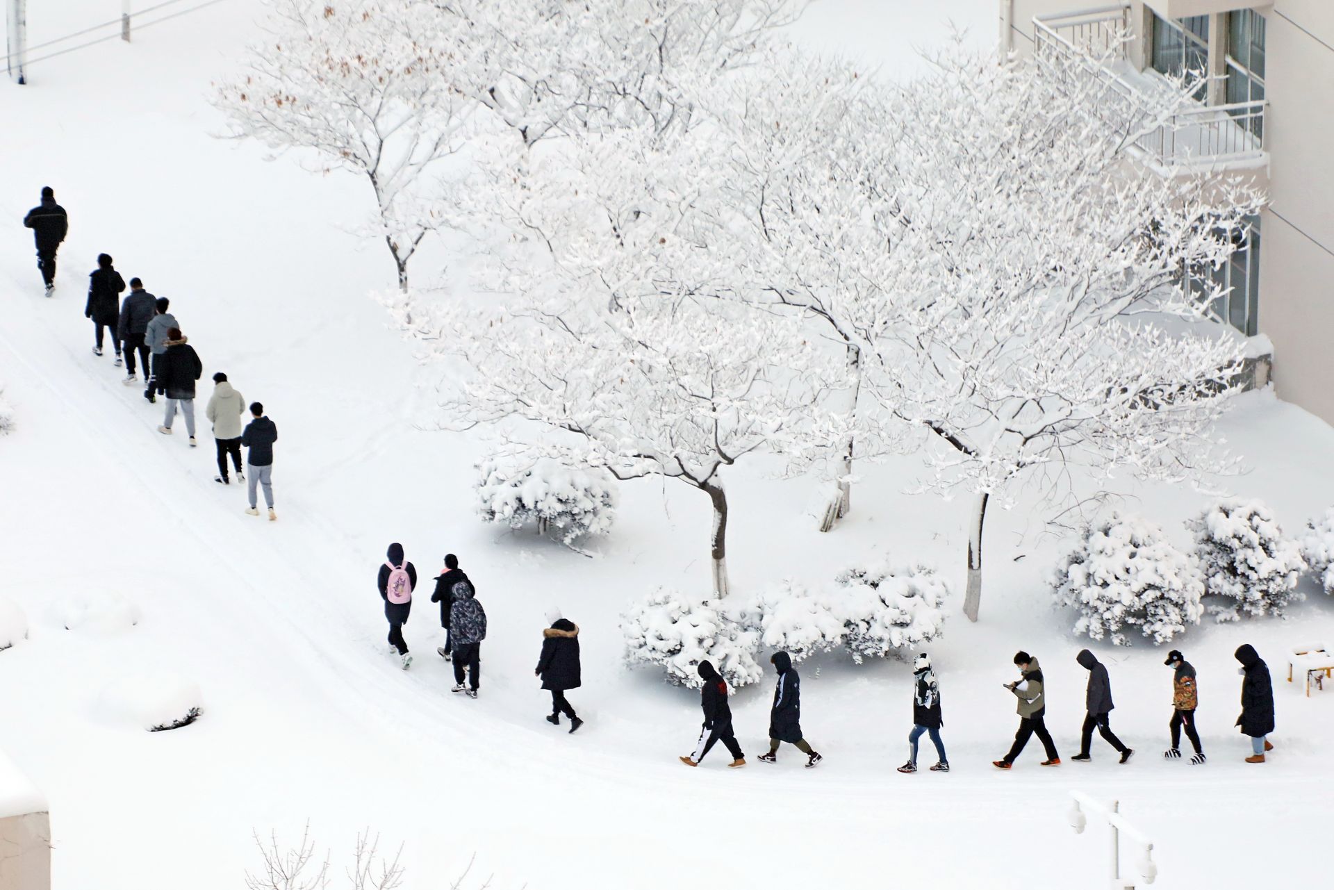 1月7日,在山东烟台理工学院,学生们踏雪出行。 新华社发(唐克 摄)