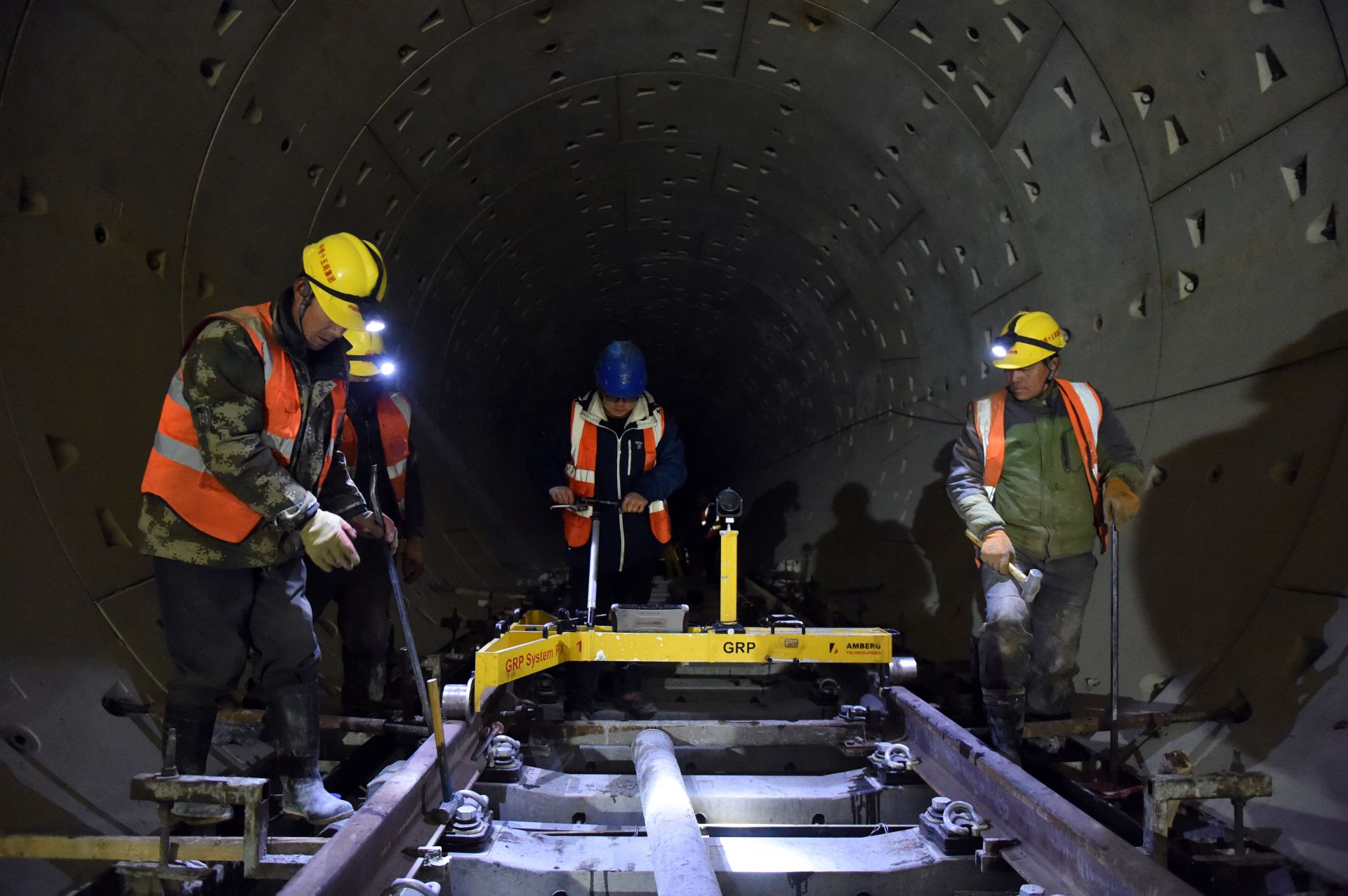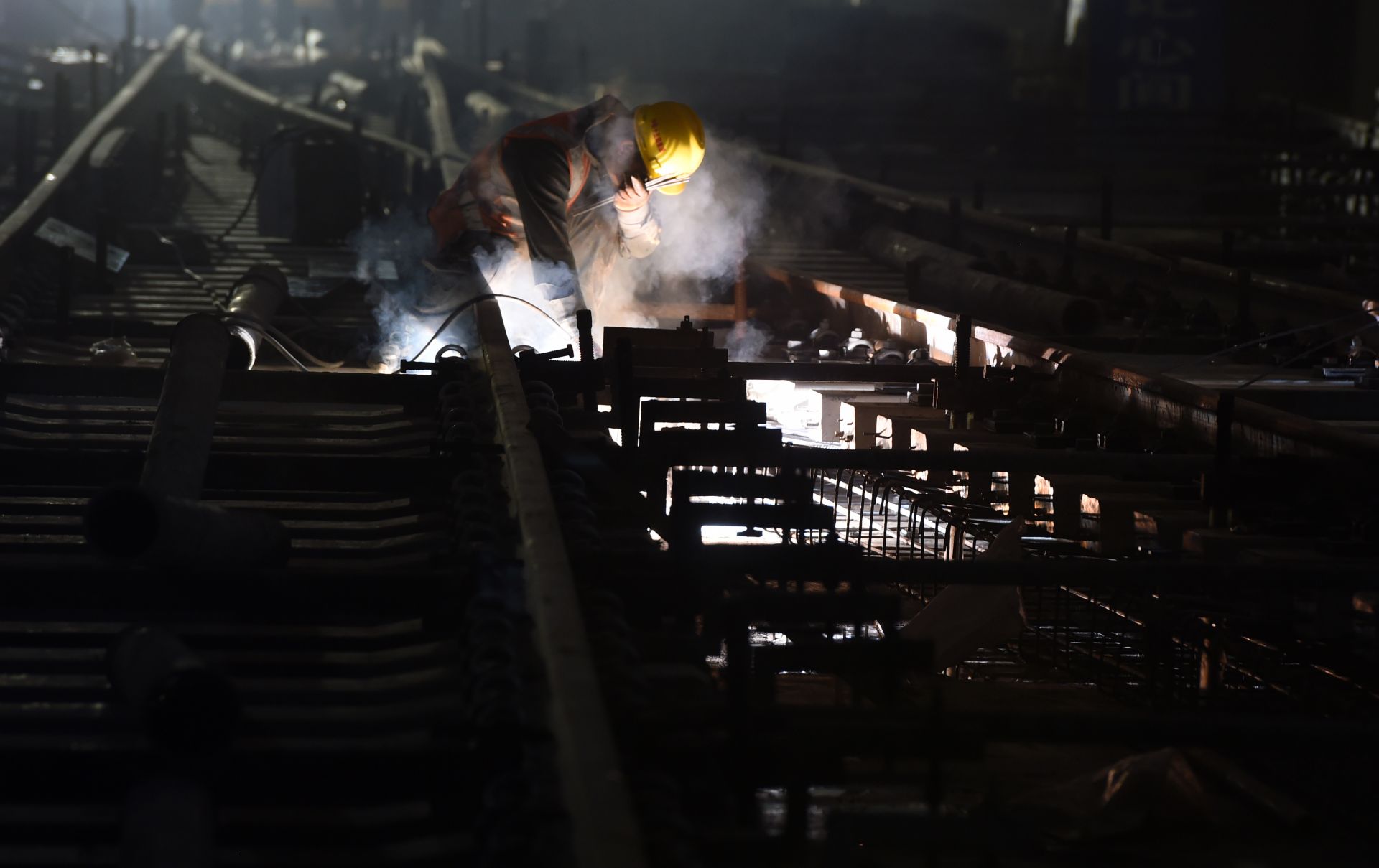 1月8日,在合肥市轨道交通四号线伊宁路站铺轨基地,施工人员在低温下进行作业。 近日,安徽省合肥市遭遇寒潮低温天气。在合肥市轨道交通四号线施工现场,来自中铁十五局的施工人员冒着严寒坚守岗位,保障正线轨道铺设项目工程进度。 新华社记者 周牧 摄
