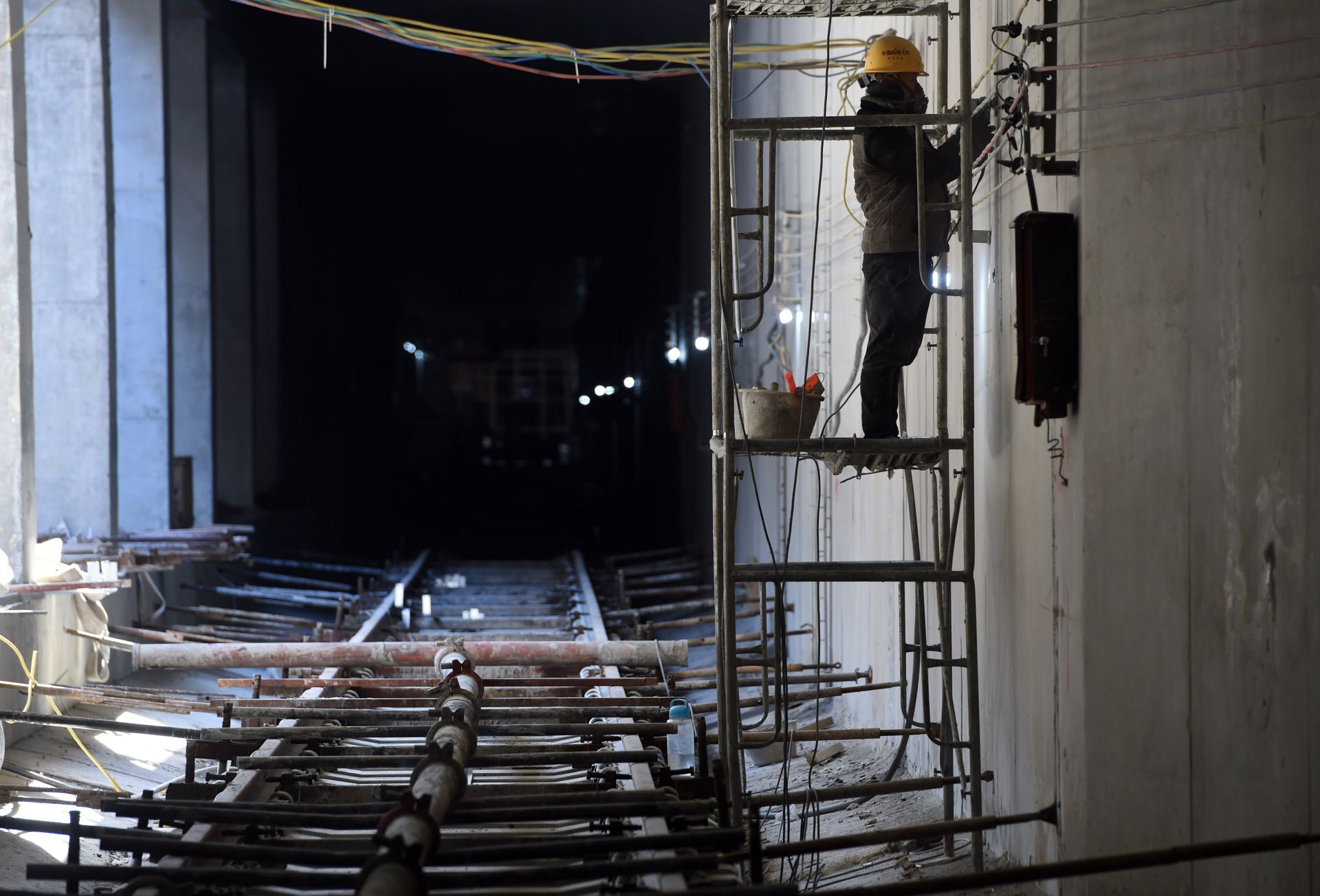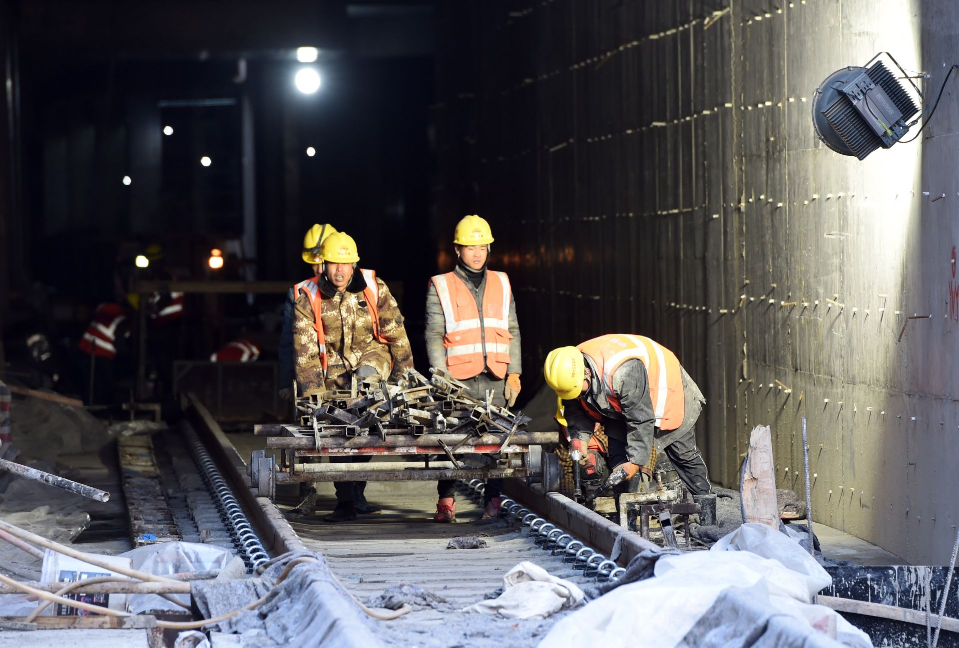 1月8日,在合肥市轨道交通四号线伊宁路站铺轨基地,施工人员在低温下进行作业。新华社记者 周牧 摄