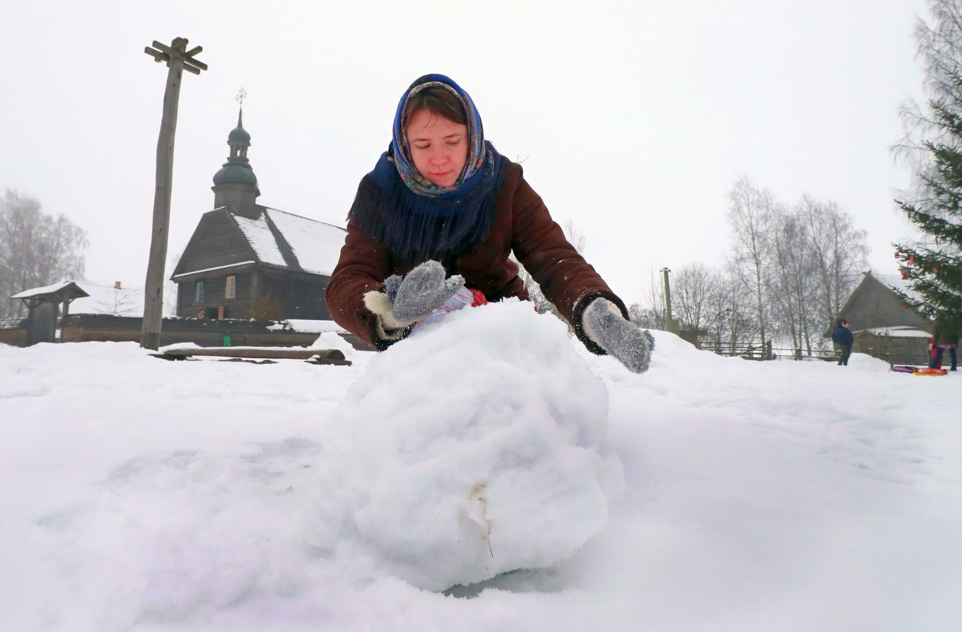 1月24日,一名女士在白俄罗斯首都明斯克郊区的民族建筑博物馆内滚雪球。新华社发(任科夫摄)