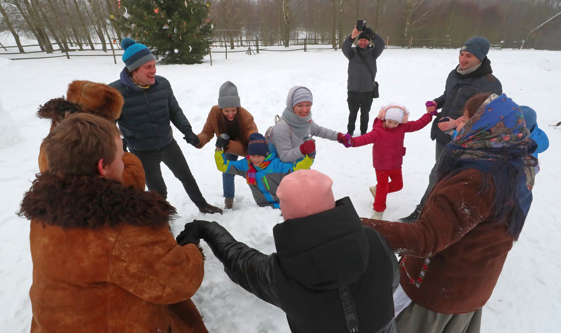 1月24日,人们在白俄罗斯首都明斯克郊区的民族建筑博物馆内围成圈跳舞。新华社发(任科夫摄)