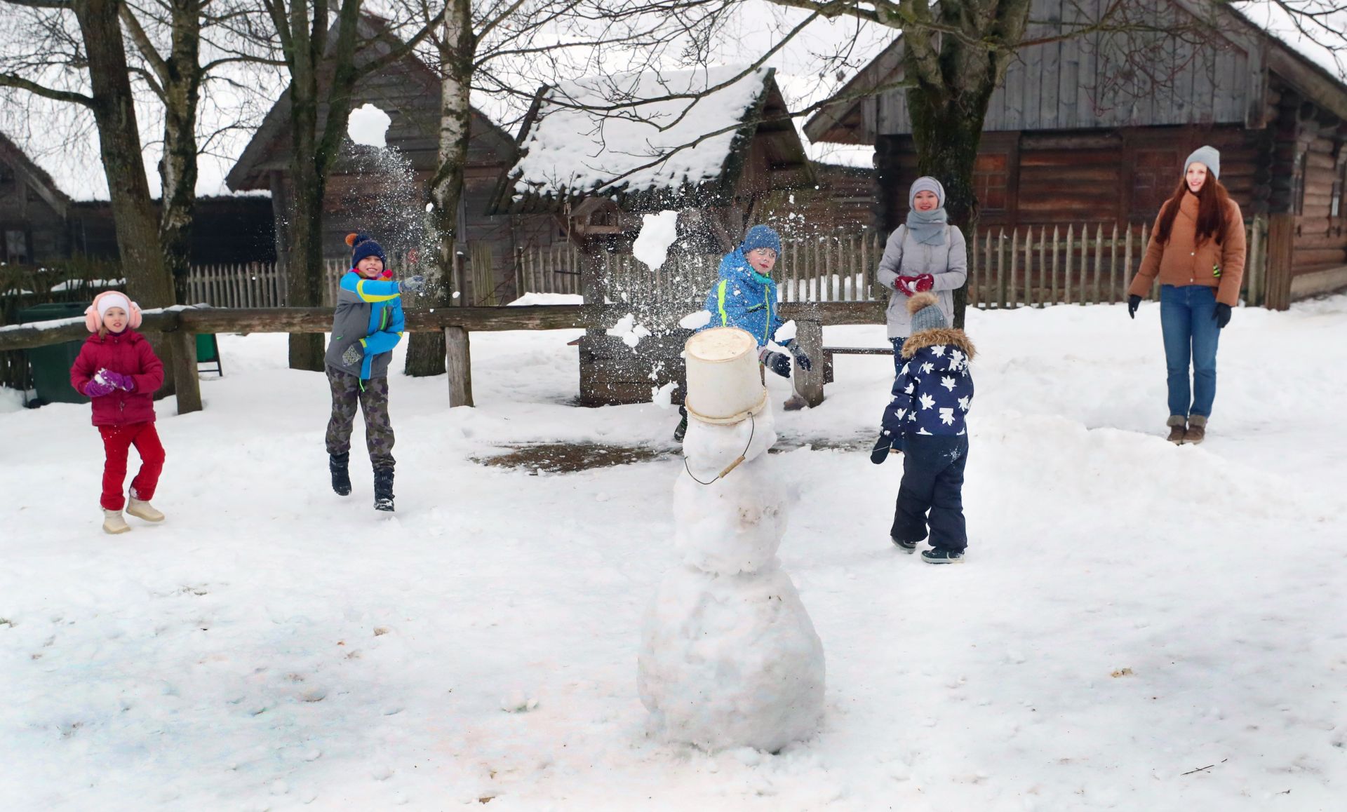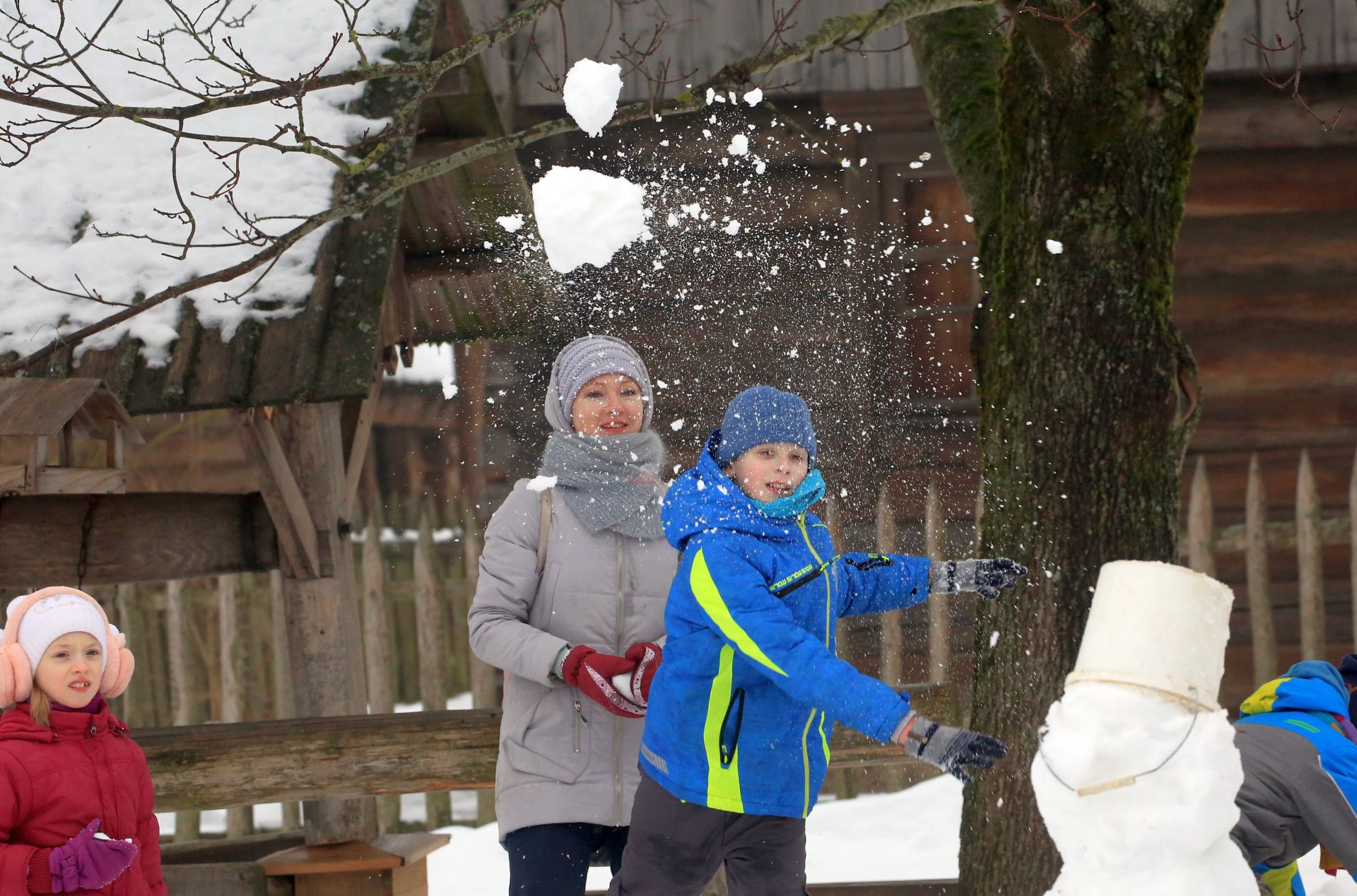 1月24日,孩子们在白俄罗斯首都明斯克郊区的民族建筑博物馆内打雪仗。新华社发(任科夫摄)