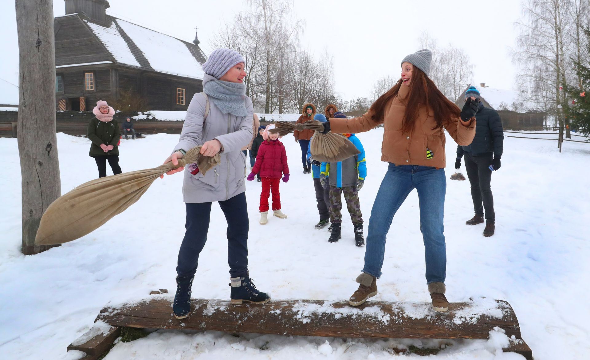 1月24日,年轻人在白俄罗斯首都明斯克郊区的民族建筑博物馆参与传统的冰雪游戏。新华社发(任科夫摄)