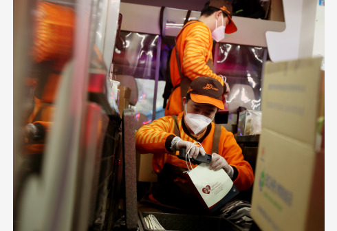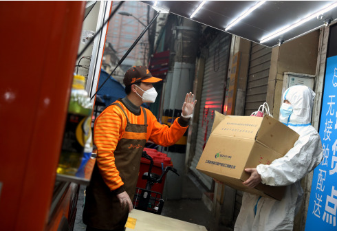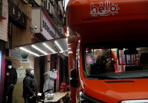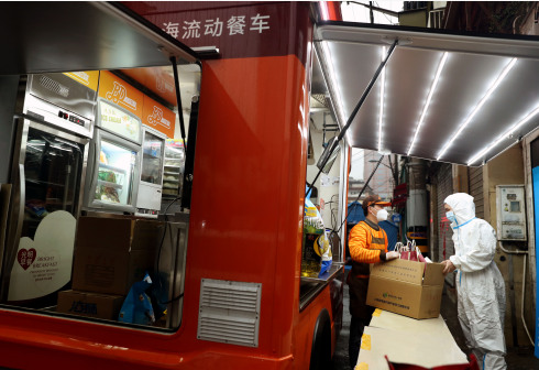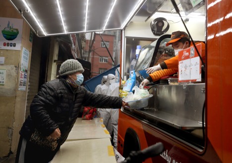 1月26日,在贵西小区的隔离线前,居民们自觉地保持距离排队购买早餐。 1月24日,上海市新冠肺炎疫情防控新闻发布会上宣布,黄浦区贵西小区列为中风险地区,实施封闭管理。 为了保障封闭小区居民的生活,经过社区、政府和企业的沟通协调,每天早上7点至9点,有一部早餐车停靠在小区的封闭隔离线外,以无接触销售的方式,为居民提供热气腾腾的健康营养早餐,直至贵西小区解除隔离。 早餐车上供应包子、鸡蛋、牛奶、玉米、现做手抓饼等热食,还有米、面、油等生活必需品,均以优惠价格销售。另外,早餐车每天为封闭小区内的志愿者们,免费提供早餐,以感谢他们的辛劳和奉献。 新华社记者 刘颖 摄