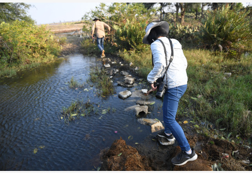 1月17日,在海南乐东莺歌海盐场进行越冬水鸟调查过程中,调查人员走过一处积水路段。 新华社记者 蒲晓旭 摄