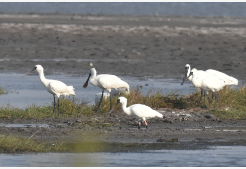 1月17日,几只黑脸琵鹭栖息在海南乐东莺歌海盐场。 新华社记者 蒲晓旭 摄