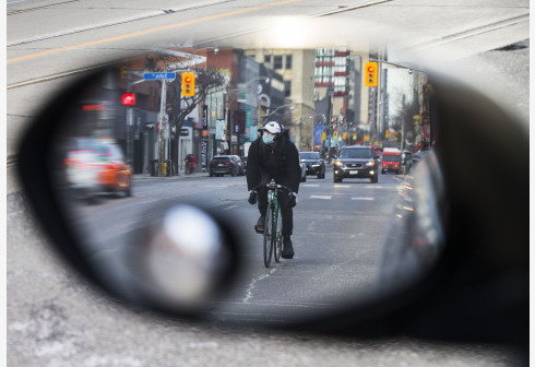 1月25日,在加拿大多伦多,一名戴口罩的男子在街头骑行。 新华社发(邹峥摄)