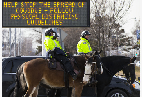 1月25日,在加拿大多伦多,骑警在街头巡逻。 据加拿大电视台25日报道,截至当天下午,加拿大累计新冠确诊病例超过75万例,达750925例;累计死亡病例19187例。 新华社发(邹峥摄)