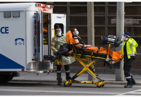 1月25日,在加拿大多伦多,医护人员将一名患者送到医院救治。 新华社发(邹峥摄)