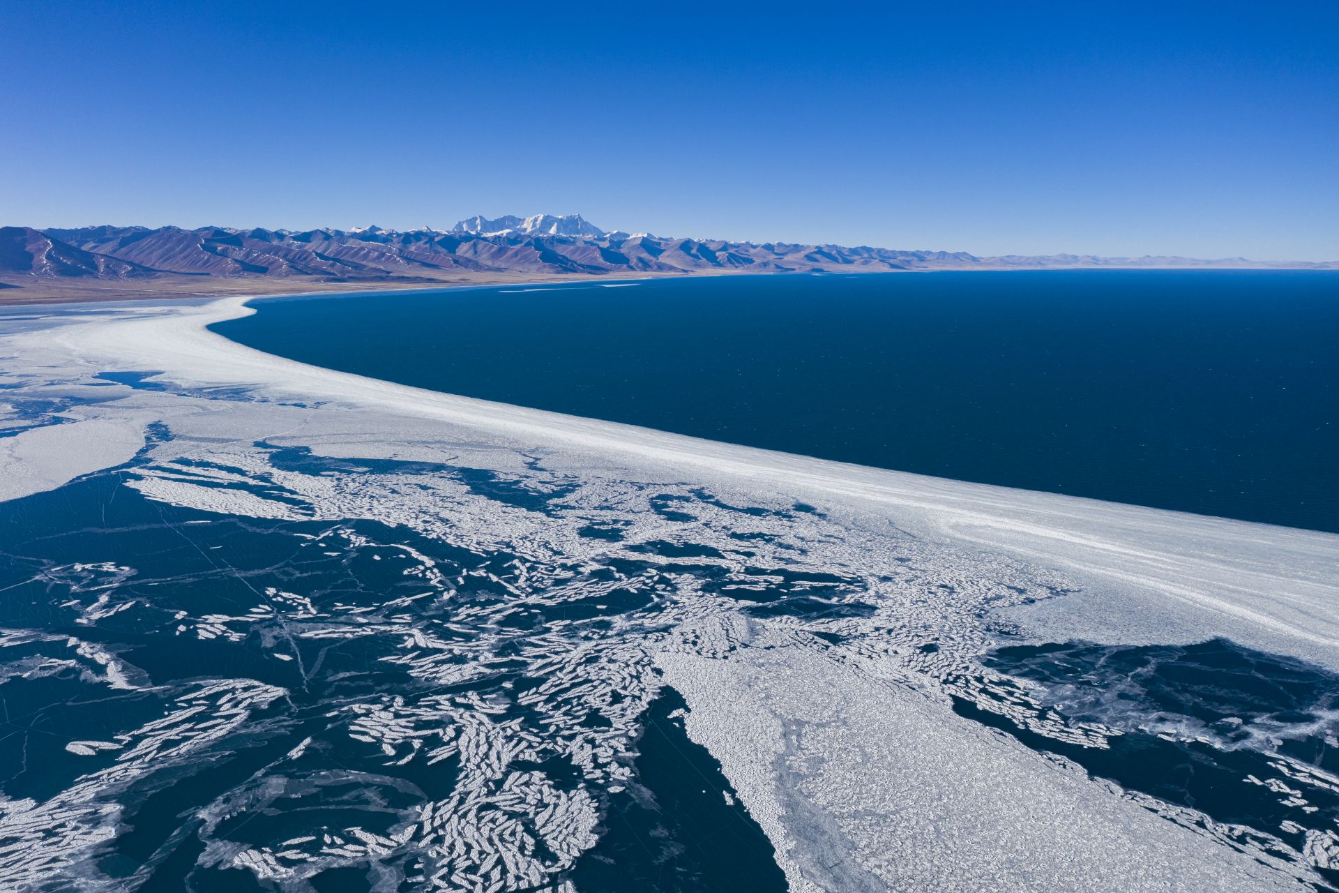 湖面结冰的纳木错(1月29日摄,无人机照片)。 在冬日的藏北高原,素有“天湖”之称的纳木错静静地依偎在雪山的怀抱中。 新华社记者 晋美多吉 摄