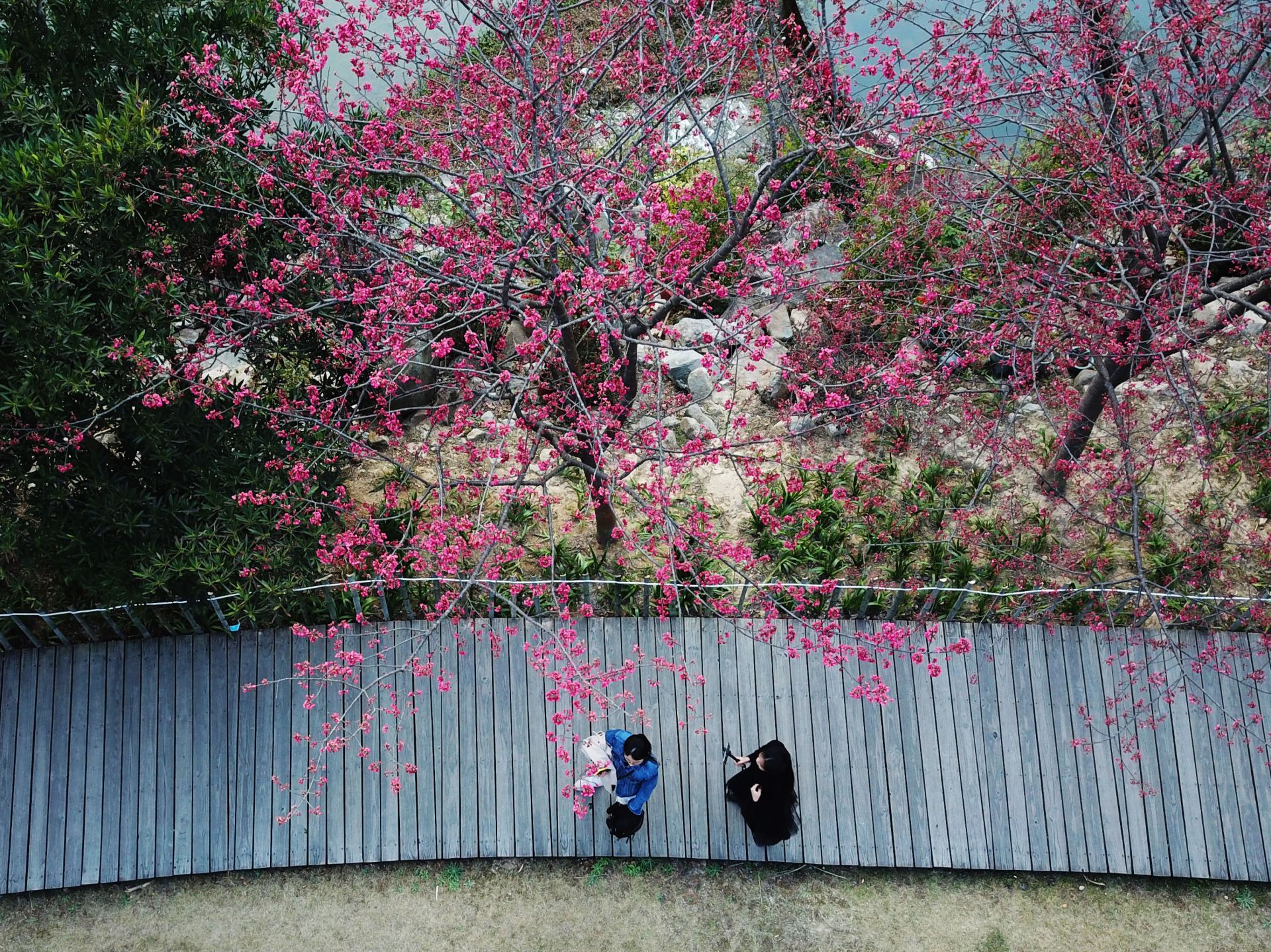 2月1日,游人在福州国家森林公园里赏樱(无人机照片)。 新华社记者 魏培全 摄