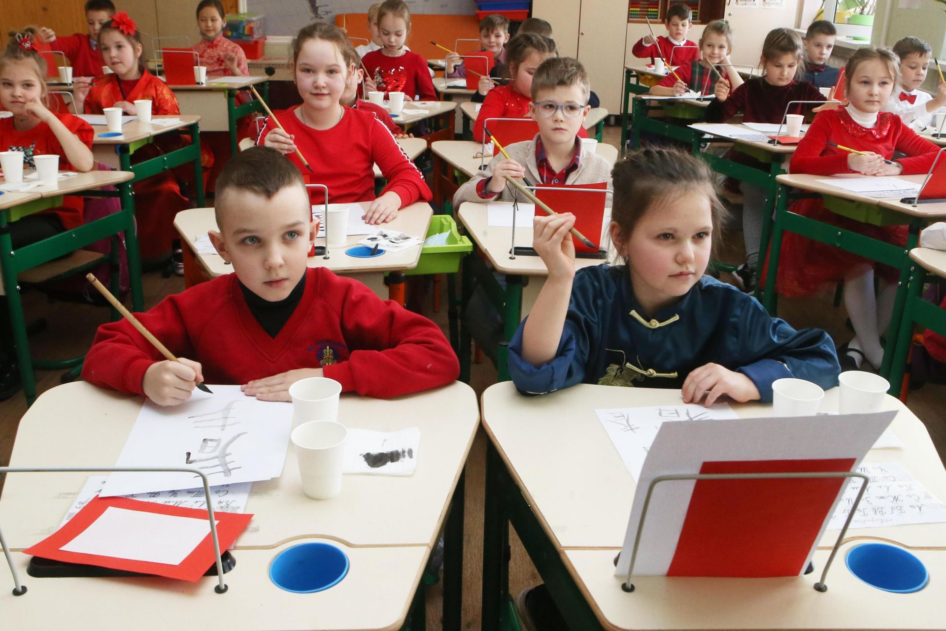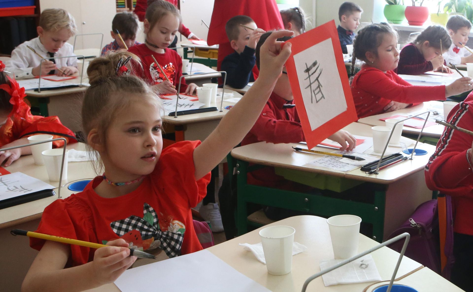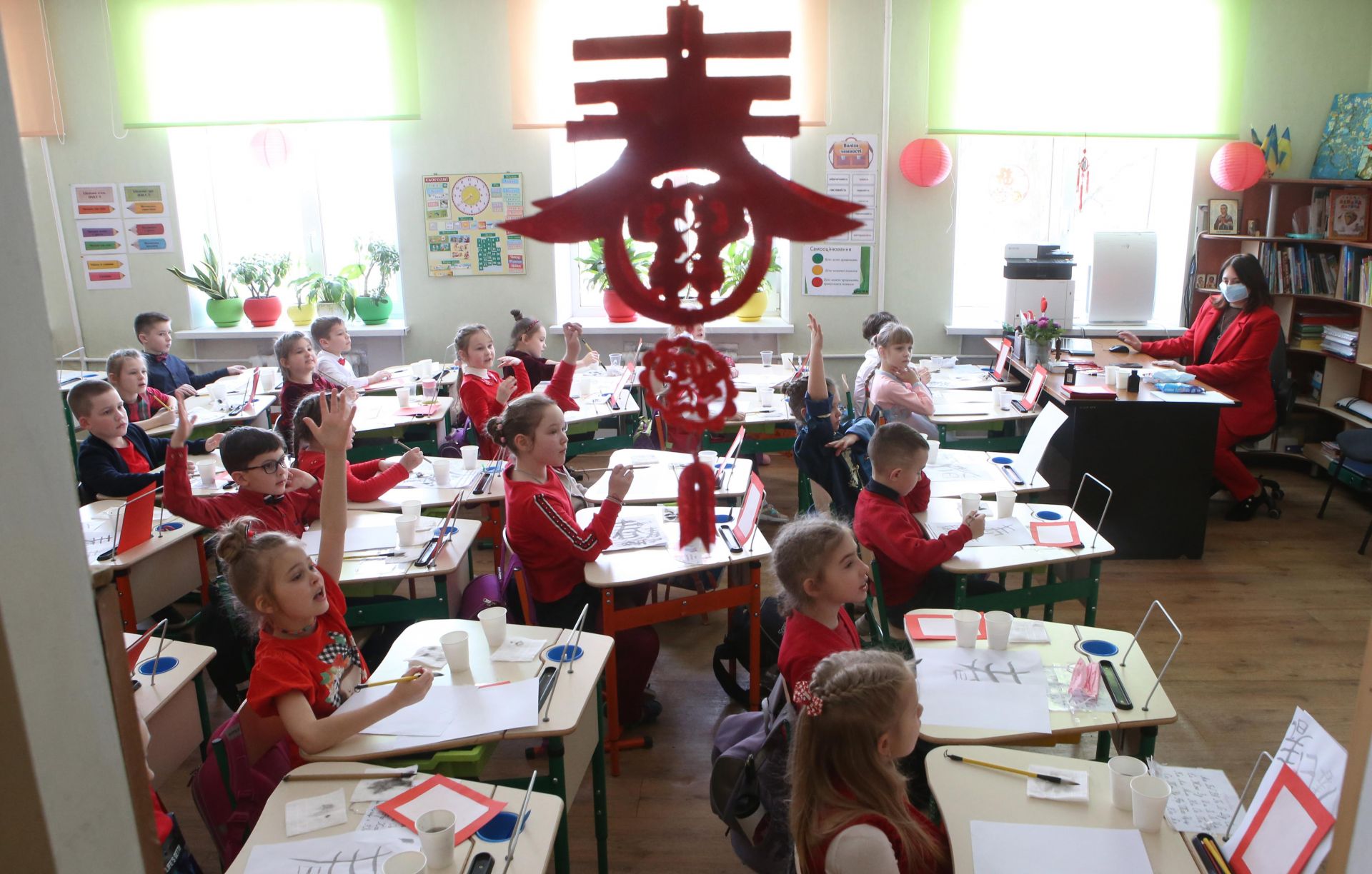 2月15日,学生在乌克兰基辅第一东方语言学校参加庆祝春节活动。 为庆祝中国春节,基辅第一东方语言学校举办了汉字书法课、中国绘画展、汉语作文比赛、茶道表演等活动,让学生在轻松愉悦的气氛中学到与春节有关的知识。 新华社发(谢尔盖·斯塔拉斯坚科摄)