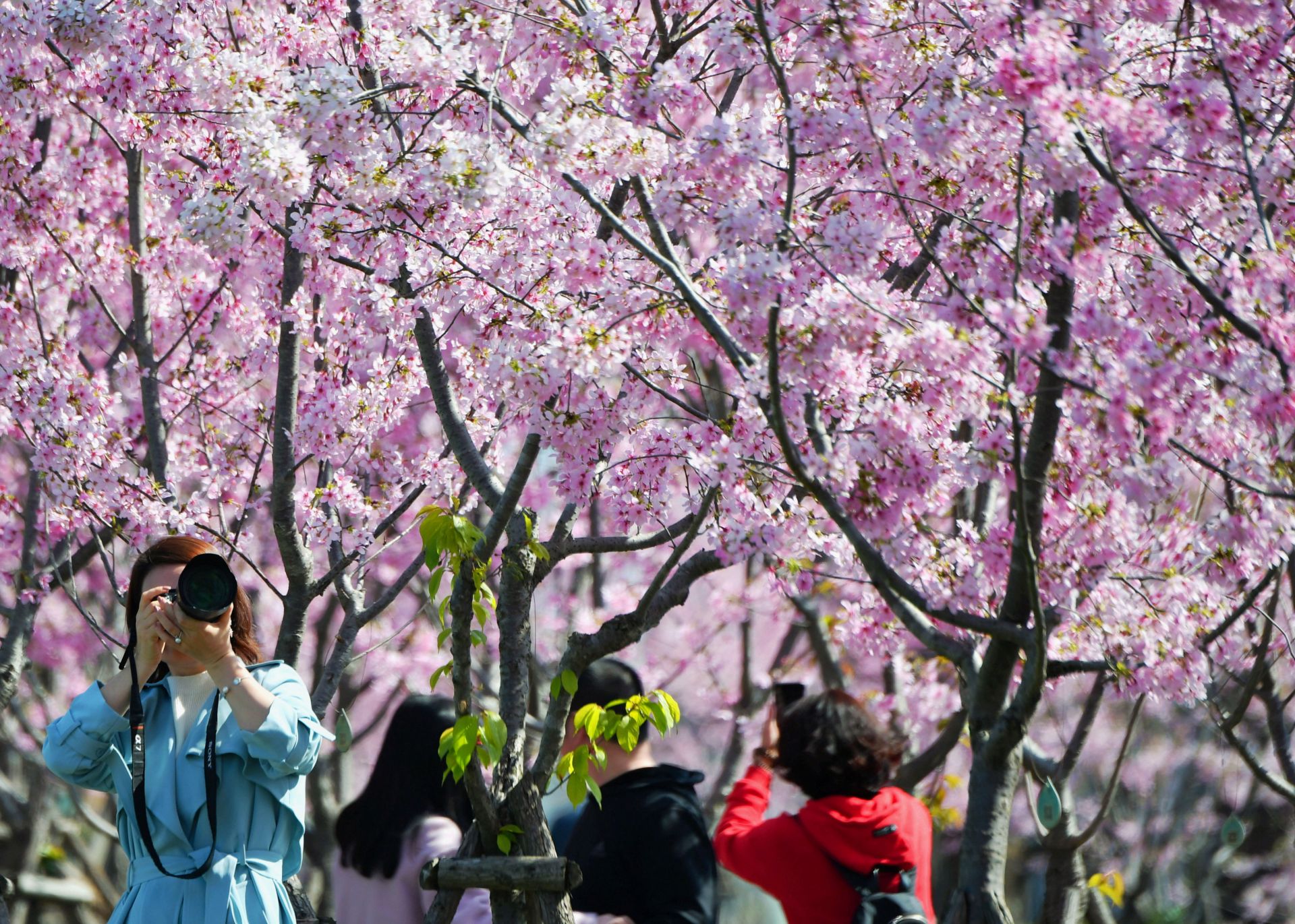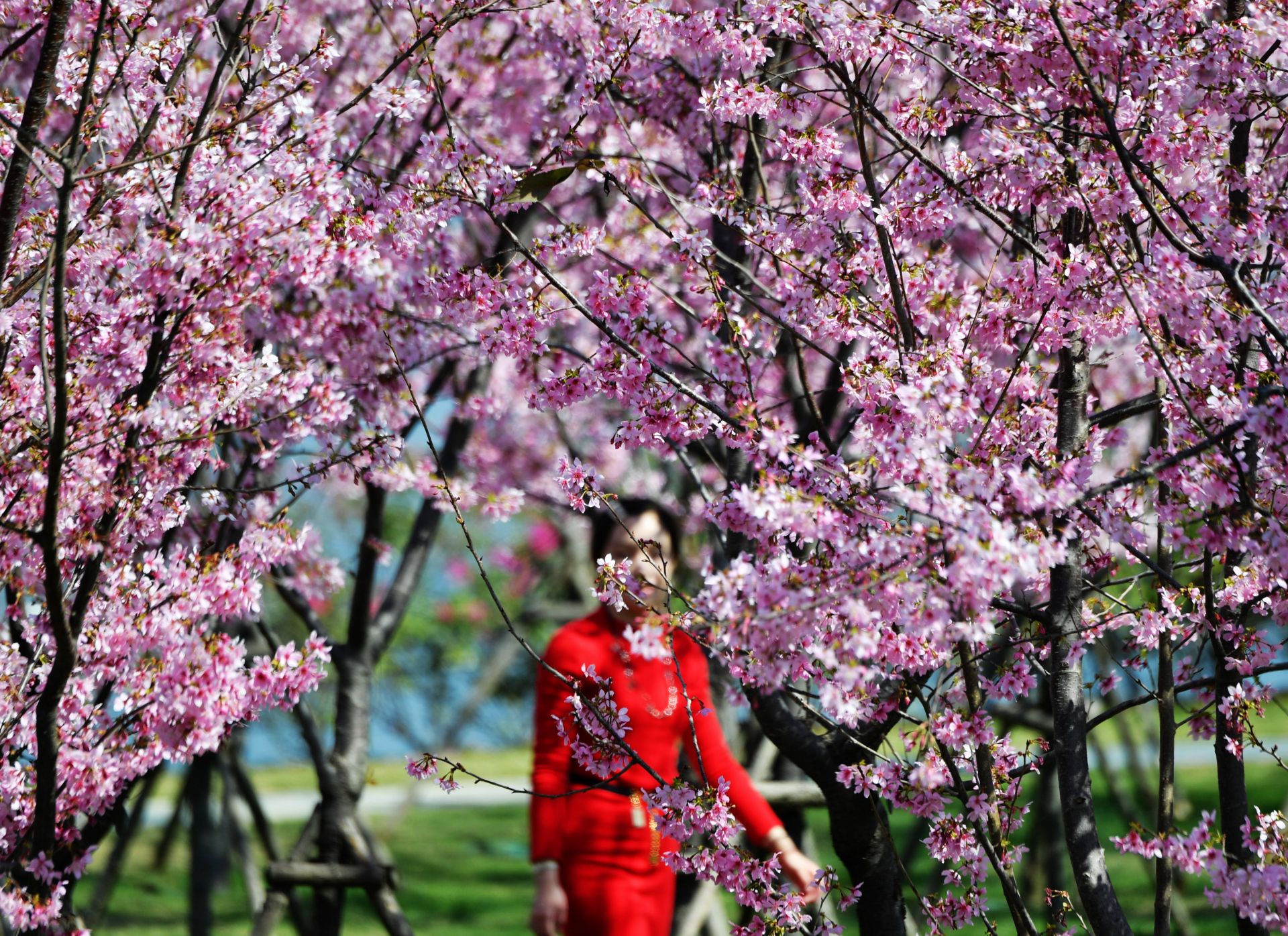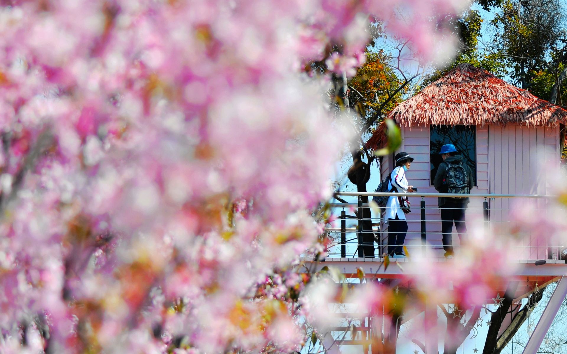 2月21日,游客在上街镇沙堤村的鲤鱼洲樱花岛欣赏盛开的樱花。 新华社记者 魏培全 摄