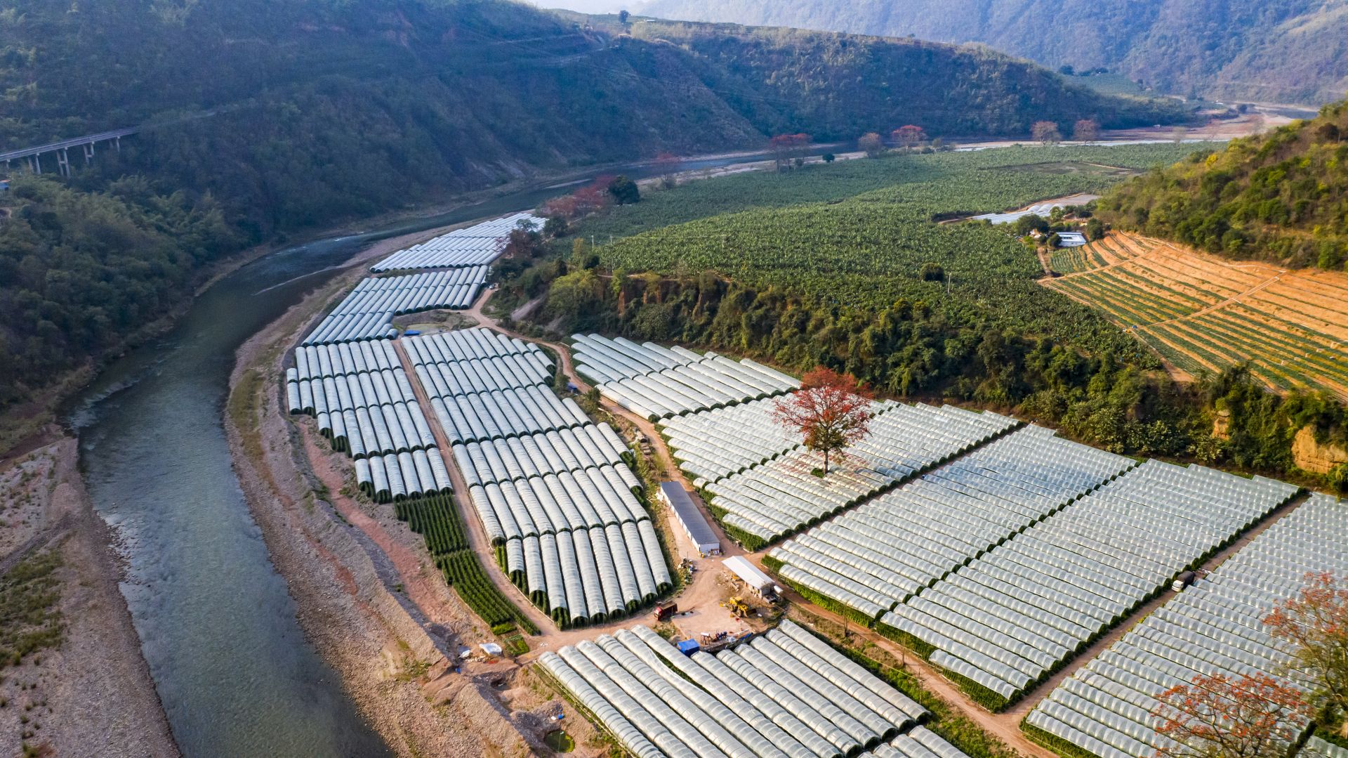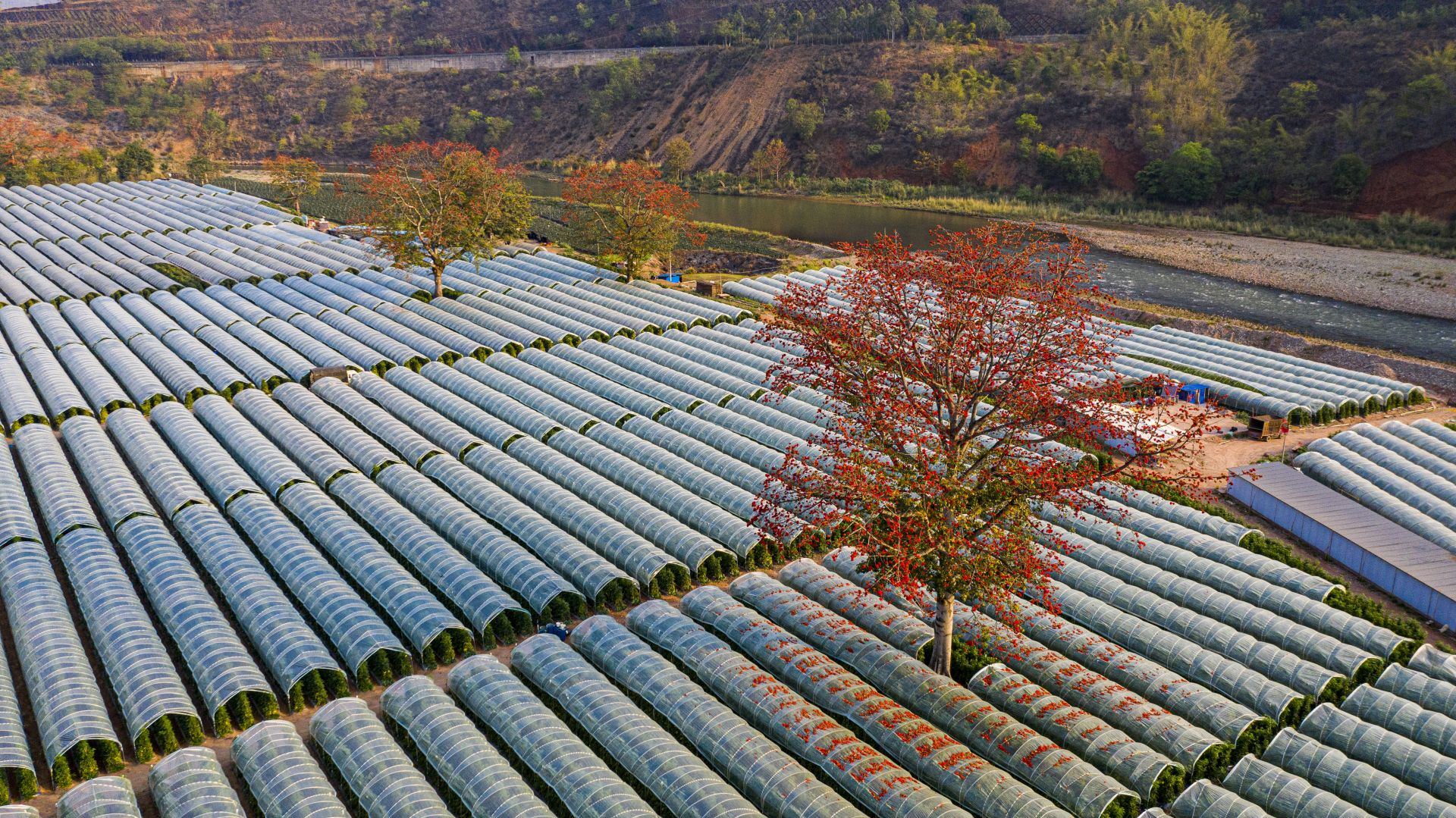 红河第一湾岸边,攀枝花盛开(2月25日摄,无人机照片)。 新华社记者 江文耀 摄