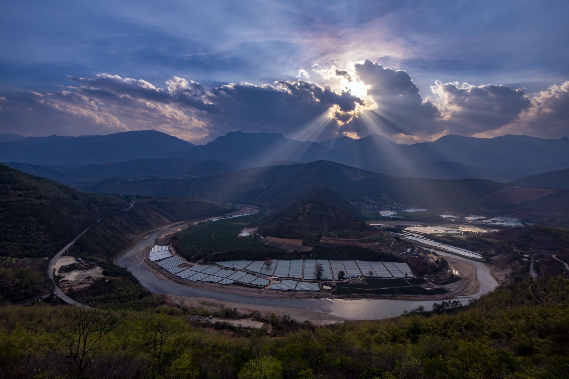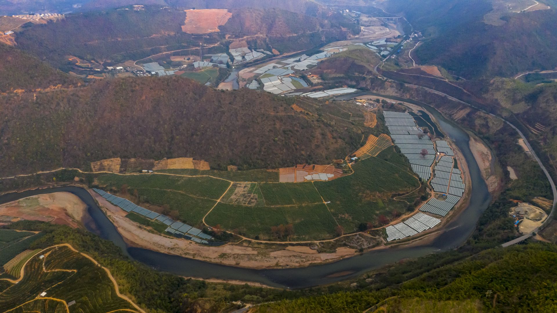 日落时分的红河第一湾(2月24日摄)。 初春时节,位于云南省新平县境内的红河第一湾两岸春意盎然,一片生机勃勃的景象。 新华社记者 江文耀 摄