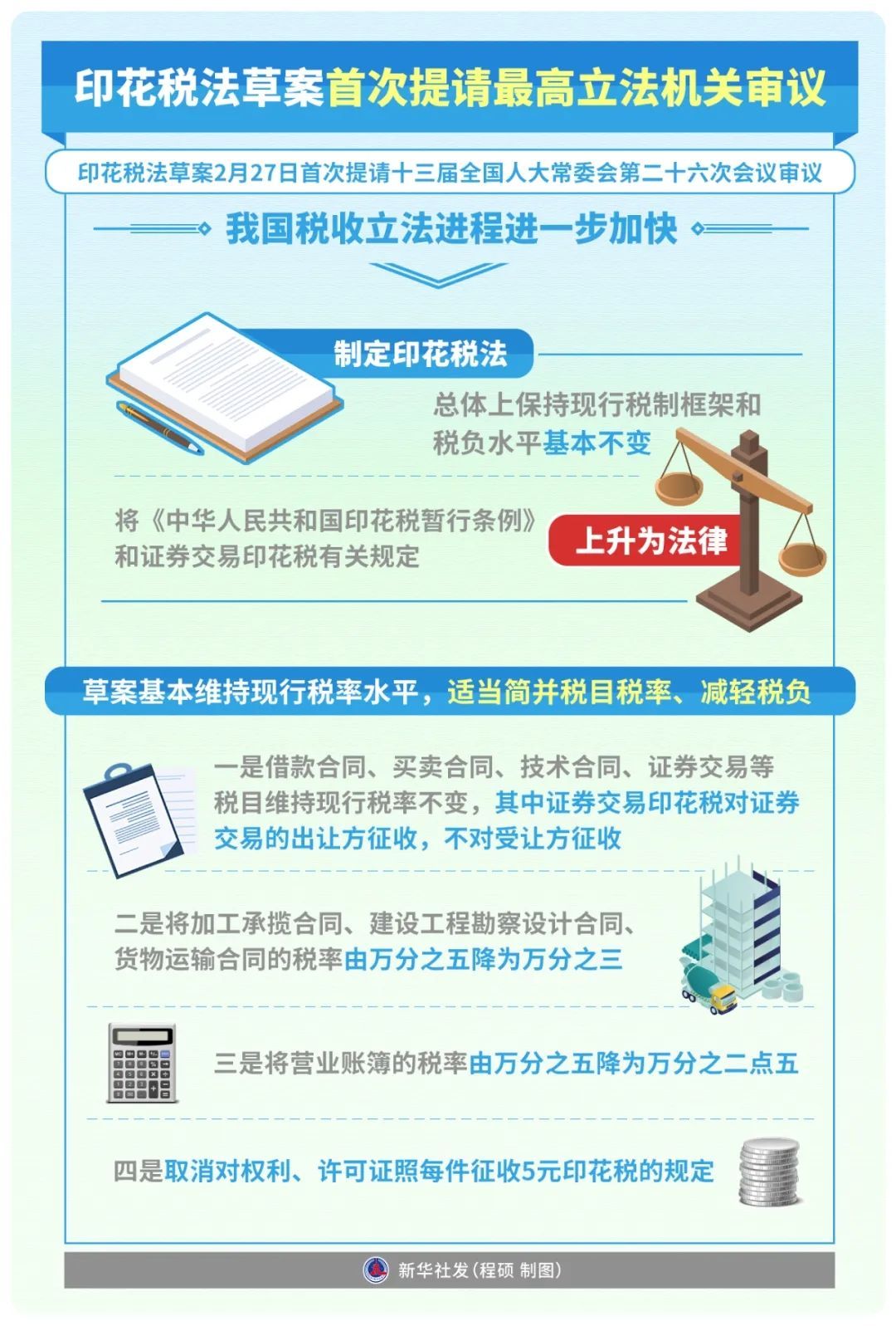 ◎ 印花税法草案首次提请十三届全国人大常委会第二十六次会议审议,草案总体上保持现行税制框架和税负水平基本不变,我国税收立法进程进一步加快。