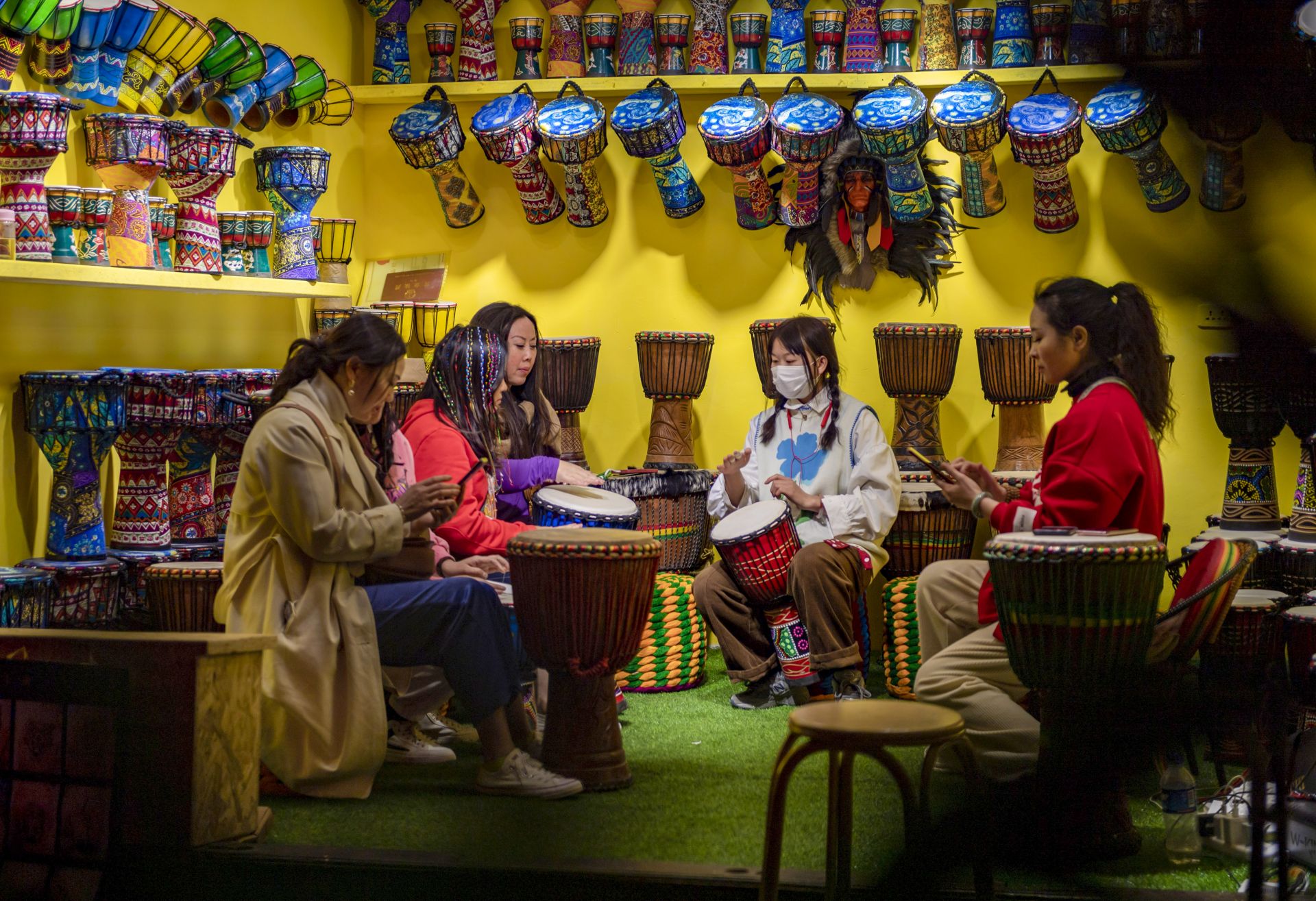 3月3日,游客在大理古城内体验打手鼓。新华社记者 陈欣波 摄