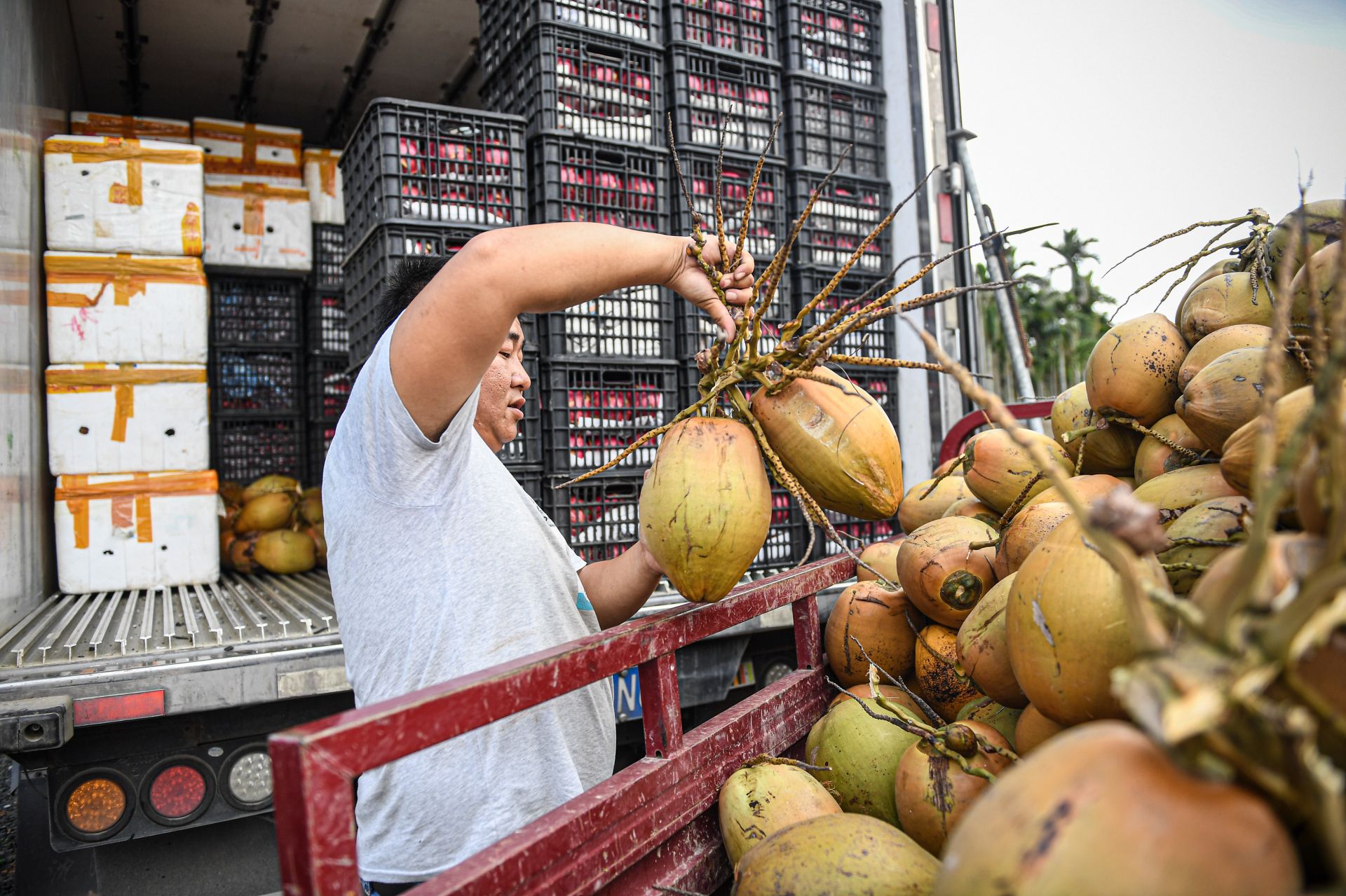 3月10日,客商在海南文昌收购“文椰”系列矮种椰子。 新华社记者 蒲晓旭 摄