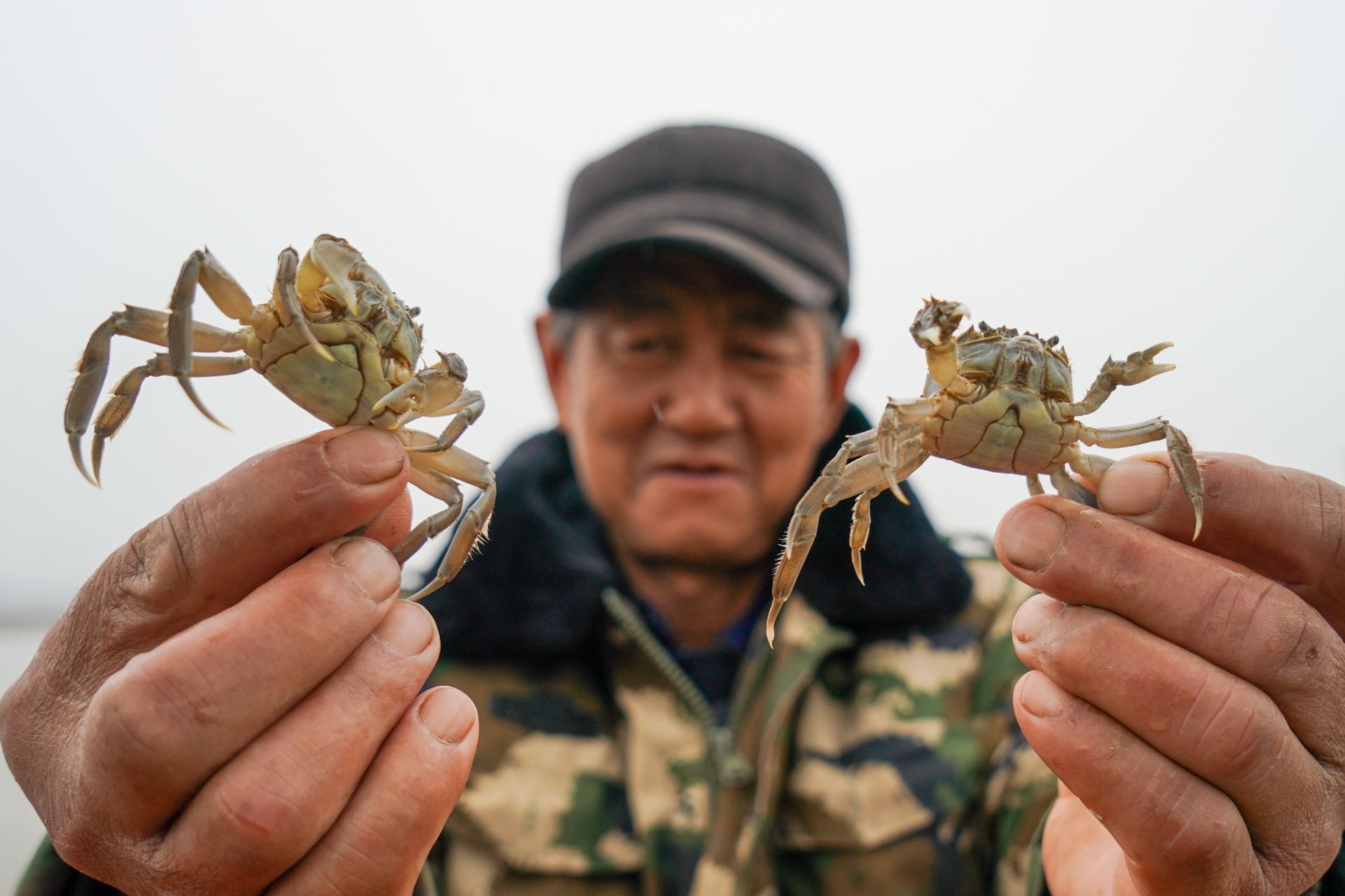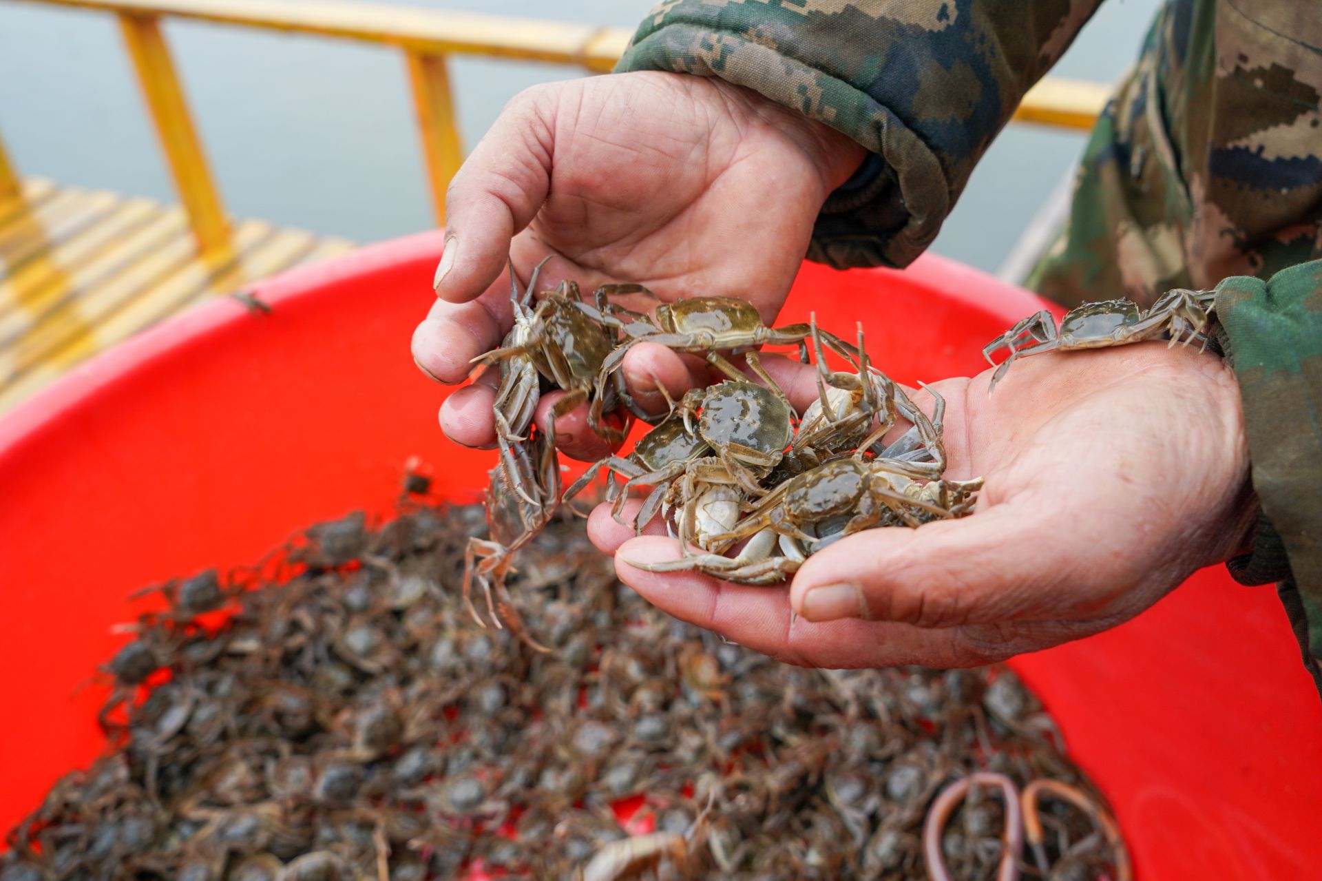 3月11日,蟹农展示即将投放的蟹苗。 新华社记者 李博 摄