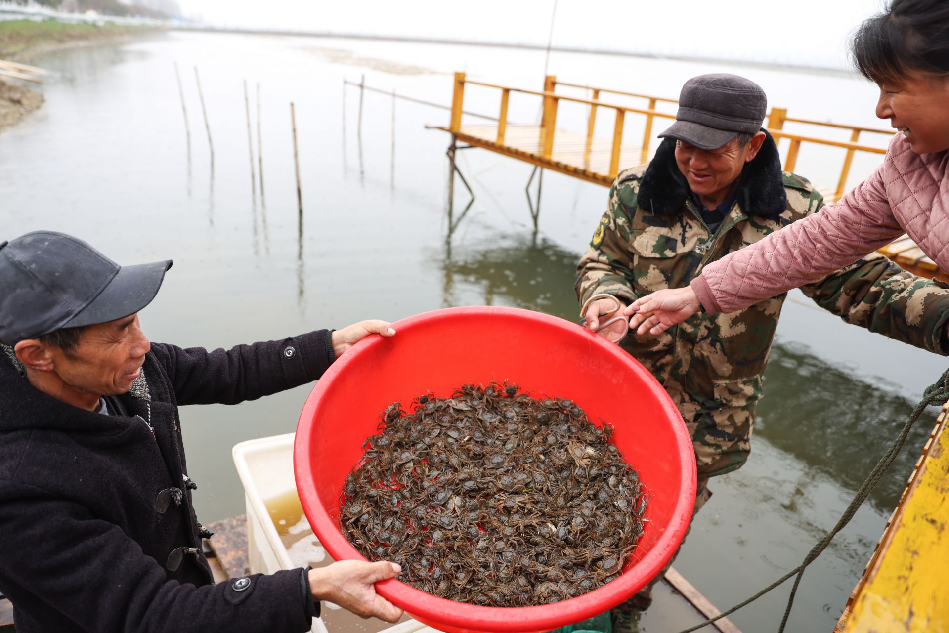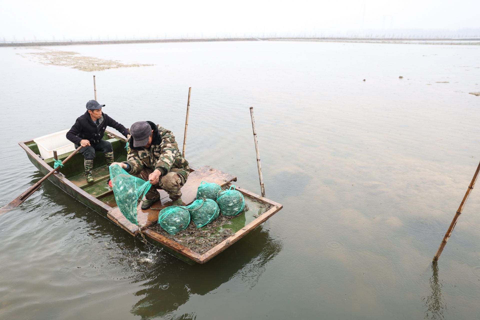 3月11日,蟹农闫家强(右)在投放蟹苗。 新华社记者 杨磊 摄