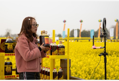 3月14日,在安州区秀水镇龙泉村的油菜花海边,一名企业员工在直播销售菜籽油。近日,四川省绵阳市安州区第二届油菜花节在秀水镇龙泉村举行,乡村民谣、旗袍汉服秀、农事体验及安州特产线上线下展销等活动为游客提供多样的休闲体验。近年来,安州区依托传统农业,以花为媒,通过乡村旅游巩固脱贫攻坚成果,助推乡村振兴。 新华社记者 江宏景 摄