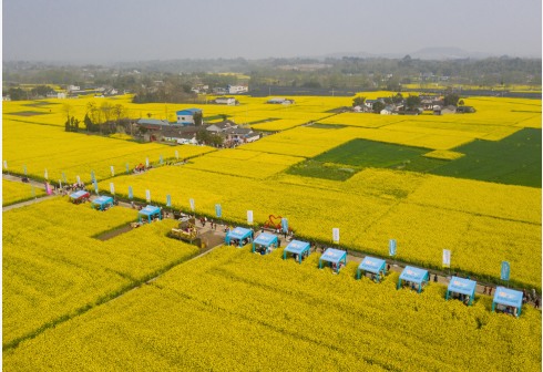 安州区秀水镇龙泉村的油菜花海(3月14日摄,无人机照片)。近日,四川省绵阳市安州区第二届油菜花节在秀水镇龙泉村举行,乡村民谣、旗袍汉服秀、农事体验及安州特产线上线下展销等活动为游客提供多样的休闲体验。近年来,安州区依托传统农业,以花为媒,通过乡村旅游巩固脱贫攻坚成果,助推乡村振兴。新华社记者 江宏景 摄