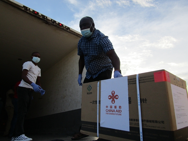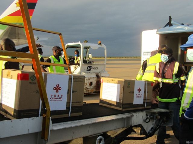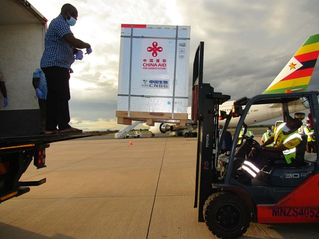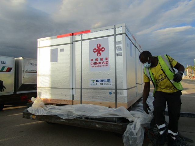 3月16日,工作人员在纳米比亚温得和克国际机场运送中国援助的新冠疫苗。中国政府援助纳米比亚的新冠疫苗16日下午经津巴布韦哈拉雷运抵纳米比亚温得和克国际机场。纳副总理兼外长恩代特瓦、卫生部长尚古拉和中国驻纳米比亚大使张益明共同在机场迎接并出席交接仪式。新华社发(卡萨克摄)