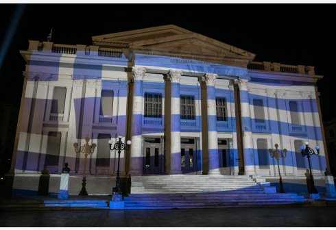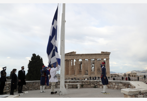 3月25日,希腊总统萨克拉罗普卢(左二)和总理米佐塔基斯(左三)在雅典卫城出席升旗仪式。1821年3月25日,希腊反对奥斯曼帝国统治的独立战争拉开序幕。希腊每年在这一天都要举行各种纪念活动。新华社 发