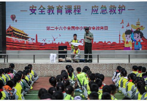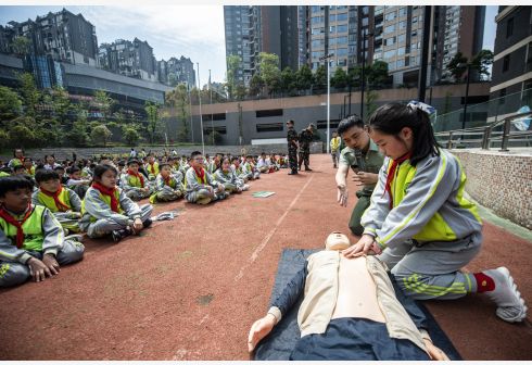 3月29日,芳草地国际学校贵阳分校的学生在学习心肺复苏救护操作。 当日是全国中小学生安全教育日,芳草地国际学校贵阳分校开展安全教育及社会实践活动,普及应急救护知识,增强学生们的安全意识。 新华社记者 陶亮 摄