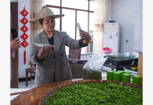 3月31日,杭州市临安区龙岗镇龙井村的致富带头人在进行直播,向网友推荐新鲜春茶。 近年来,浙江省杭州市临安区龙岗镇积极探索人才引进机制,有序推进农村优秀人才回引,让优秀青年人才根据各村特色拓展发展思路,通过网络直播带货、乡村旅游推介、引导开办特色民宿等方式,助力乡村振兴。 新华社记者 徐昱 摄