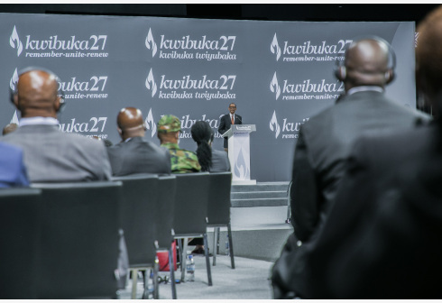 4月7日,卢旺达总统卡加梅在基加利举行的大屠杀27周年纪念活动上发表讲话。1994年4月至7月,卢旺达图西和胡图两大部族发生大规模暴力冲突,共有50万至100万人惨遭屠戮,其中大部分遇难者为图西族人。联合国将每年的4月7日定为“反思卢旺达大屠杀国际日”,在2018年改名为“反思1994年针对图西族的卢旺达大屠杀国际日”。新华社 发(西里尔·恩德格亚 摄)