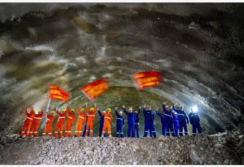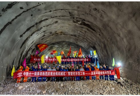 4月12日,中铁十一局建设者在郑万高铁高家坪隧道庆祝贯通。当日,由中铁十一局承建的郑万高铁高家坪隧道顺利贯通。该隧道位于湖北省南漳县境内,全长5506米,工程地质复杂,施工难度大、安全风险高,为郑万高铁重难点控制性工程。郑万高铁全长818公里,设计时速350公里,起于郑州南站,经过湖北、重庆,终到万州北站,是我国“八纵八横”高铁网中京昆通道的重要组成部分。郑万高铁全程桥隧比高达90%以上,被誉为世界高铁领域难度最大、风险最高的铁路。新华社记者 杜华举 摄