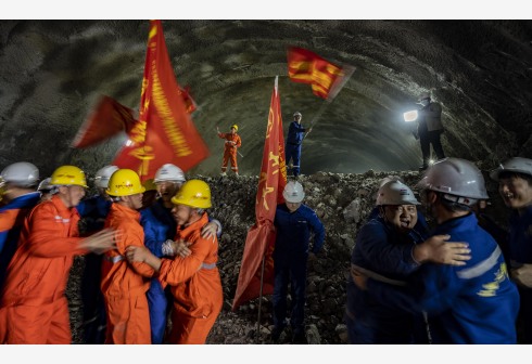 4月12日,中铁十一局建设者在郑万高铁高家坪隧道庆祝贯通。当日,由中铁十一局承建的郑万高铁高家坪隧道顺利贯通。该隧道位于湖北省南漳县境内,全长5506米,工程地质复杂,施工难度大、安全风险高,为郑万高铁重难点控制性工程。郑万高铁全长818公里,设计时速350公里,起于郑州南站,经过湖北、重庆,终到万州北站,是我国“八纵八横”高铁网中京昆通道的重要组成部分。郑万高铁全程桥隧比高达90%以上,被誉为世界高铁领域难度最大、风险最高的铁路。 新华社记者 杜华举 摄