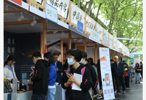 4月16日,参观者在参观文化创意展。当日,中国数字阅读大会文化创意展在杭州西湖畔举行,通过“文化+科技”“文化+生活”的展现,倡导共建书香社会。4月16日,以“数字赋能新发展,阅读追梦新征程”为主题的第七届中国数字阅读大会在杭州召开。 新华社记者 翁忻旸 摄
