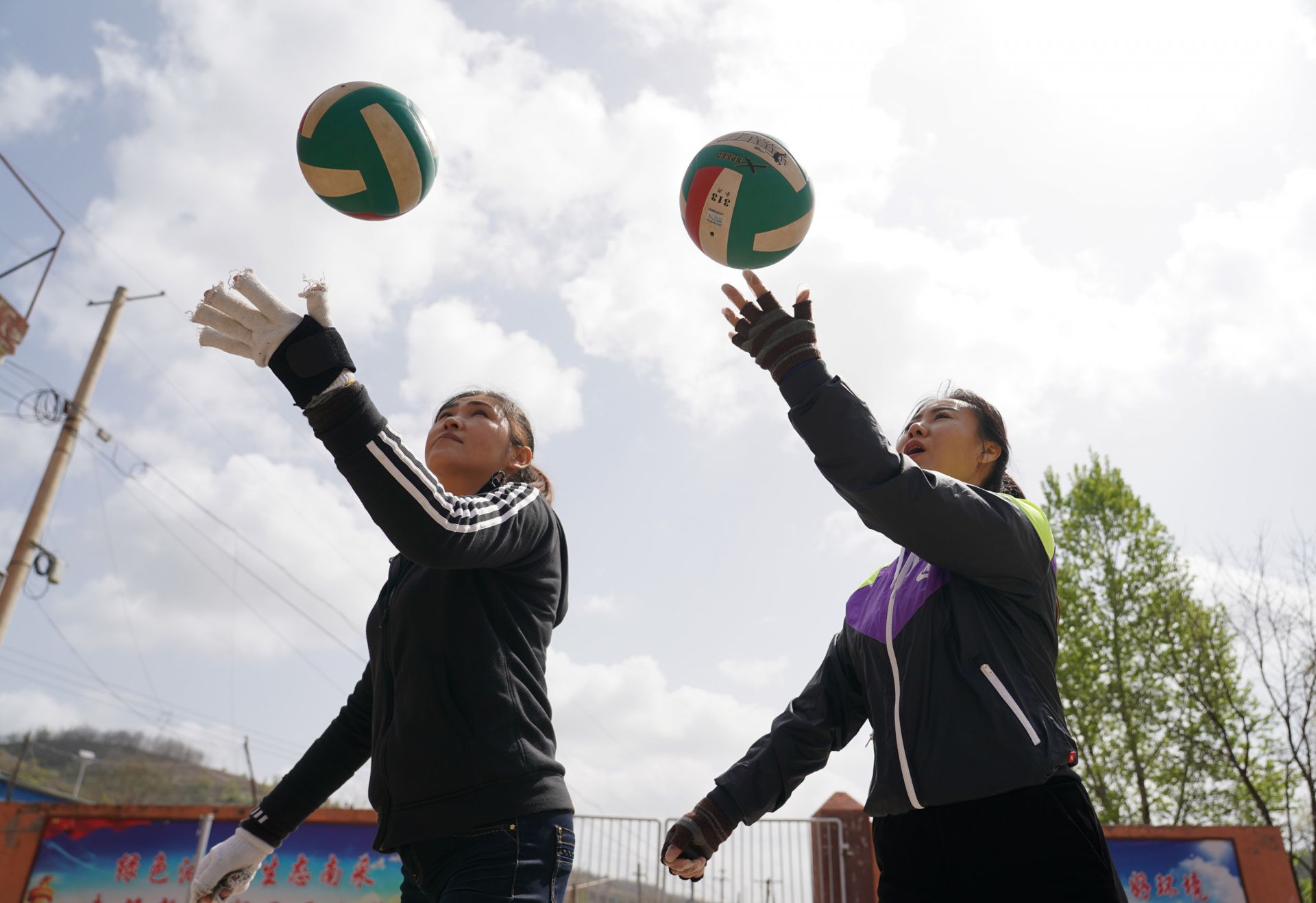 4月26日,在女子采油站院内,站长刘小莉(右)在工作闲暇指导同事刘向利练习排球发球。