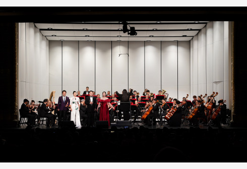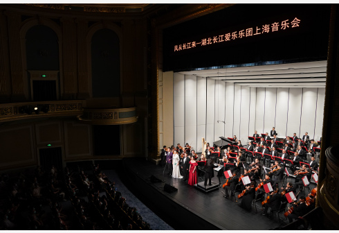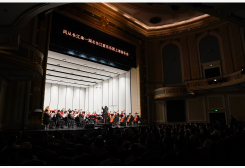 这是6月10日拍摄的音乐会演出现场。当晚,由湖北长江爱乐乐团主办的“风从长江来”主题音乐会在上海音乐厅演出,表演者演奏了《长江之歌》《武汉圆舞2020》《百年颂》等多首曲目。 新华社记者 丁汀 摄