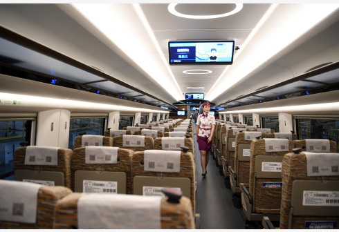 6月23日,乘务人员从CR400AF复兴号智能动车组车厢内走过。
