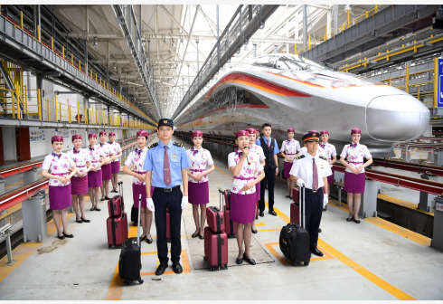 6月23日,CR400AF复兴号智能动车组及乘务组在重庆车辆段西动车所亮相。