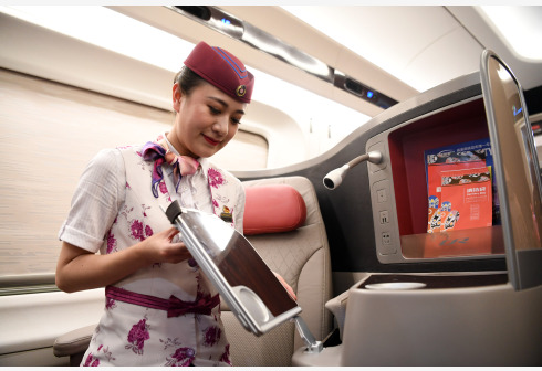 6月23日,乘务人员在CR400AF复兴号智能动车组车厢内进行设备功能展示。 当日,CR400AF复兴号智能动车组在中国铁路成都局集团有限公司重庆车辆段西动车所正式亮相,该动车组将于6月25日投入成渝城际铁路运营。 据了解,具有完全自主知识产权的复兴号智能动车组2019年12月率先在京张高铁投用,6月25日,复兴号智能动车组将扩大至京沪、京广、京哈、徐兰及成渝高铁开行。