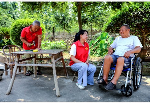 6月23日,在长兴县小浦镇合溪村,党员志愿者为残疾人王金明(右一)送上轮椅。
