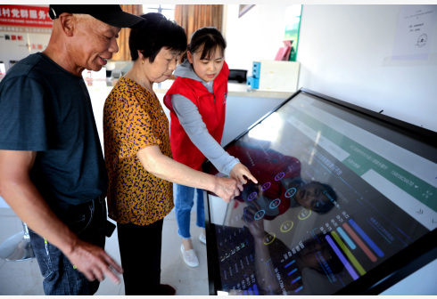 6月23日,在长兴县小浦镇光耀村便民服务大厅,巾帼志愿者通过生活垃圾分类智慧大数据平台,为村民讲解垃圾分类。