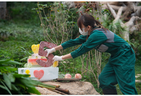 6月26日,澳门大熊猫馆饲养员为大熊猫“健健”准备生日蛋糕。 当日,中央政府赠送澳门特区的大熊猫“开开”“心心”的双胞胎儿子“健健”“康康”迎来5周岁生日。澳门特区政府市政署工作人员为这对大熊猫双胞胎准备了特制的生日蛋糕。 新华社记者 张金加 摄