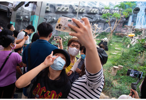 6月26日,市民观看大熊猫“健健”过生日。 当日,中央政府赠送澳门特区的大熊猫“开开”“心心”的双胞胎儿子“健健”“康康”迎来5周岁生日。澳门特区政府市政署工作人员为这对大熊猫双胞胎准备了特制的生日蛋糕。 新华社记者 张金加 摄