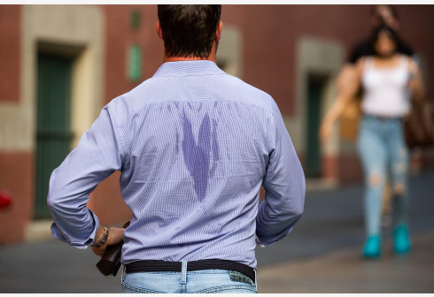 6月29日,一名行人走在美国纽约街头,汗水浸透了他的衬衫。纽约近日持续高温,当天气温超过34摄氏度。 新华社 发(郭克 摄)