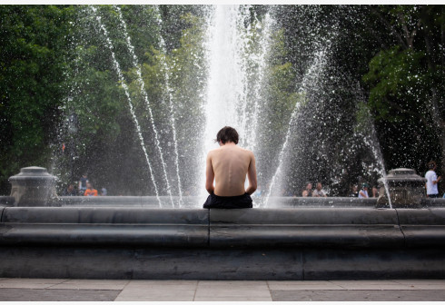 6月29日,在美国纽约一处公园,一名男子坐在喷泉边纳凉。纽约近日持续高温,当天气温超过34摄氏度。 新华社 发(郭克 摄)