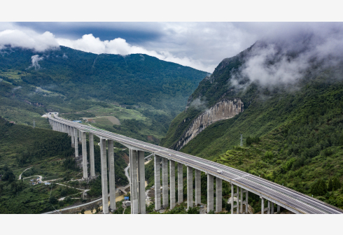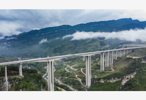 7月1日,车辆行驶在正习高速复兴大桥上(无人机照片)。7月1日,贵州省遵义市正(安)习(水)高速公路全线通车。正习高速公路横穿乌蒙山区域,途经正安、桐梓、习水3县,全长约130公里。新华社记者 陶亮 摄