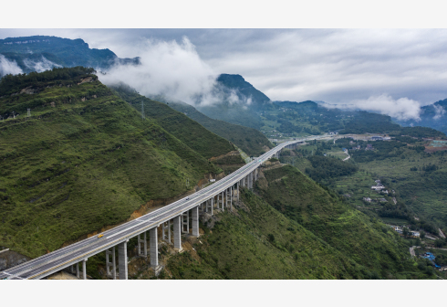 7月1日,车辆行驶在正习高速道角大桥上(无人机照片)。7月1日,贵州省遵义市正(安)习(水)高速公路全线通车。正习高速公路横穿乌蒙山区域,途经正安、桐梓、习水3县,全长约130公里。 新华社记者 陶亮 摄