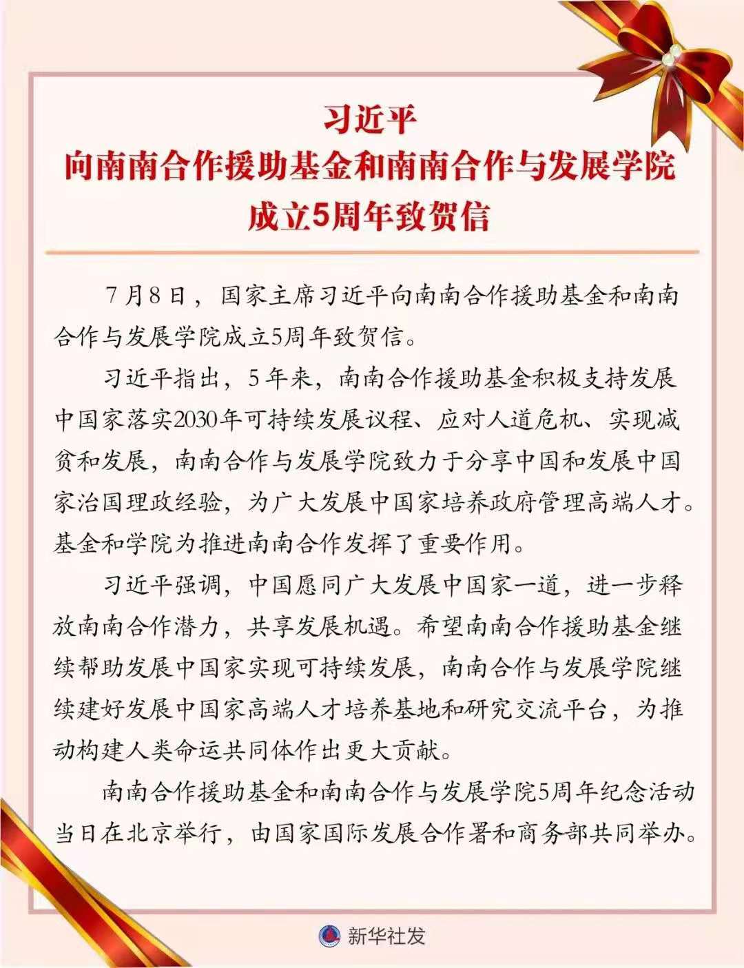 ◎习近平向南南合作援助基金和南南合作与发展学院成立5周年致贺信。