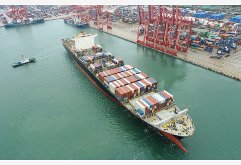 7月13日,在江苏连云港港集装箱码头,一艘装载集装箱的船舶离港(无人机照片)。 7月13日,海关总署发布数据,今年上半年我国货物贸易进出口总值18.07万亿元人民币,比去年同期增长27.1%,连续13个月实现同比正增长,外贸稳增长态势进一步巩固。 新华社发(王健民 摄)